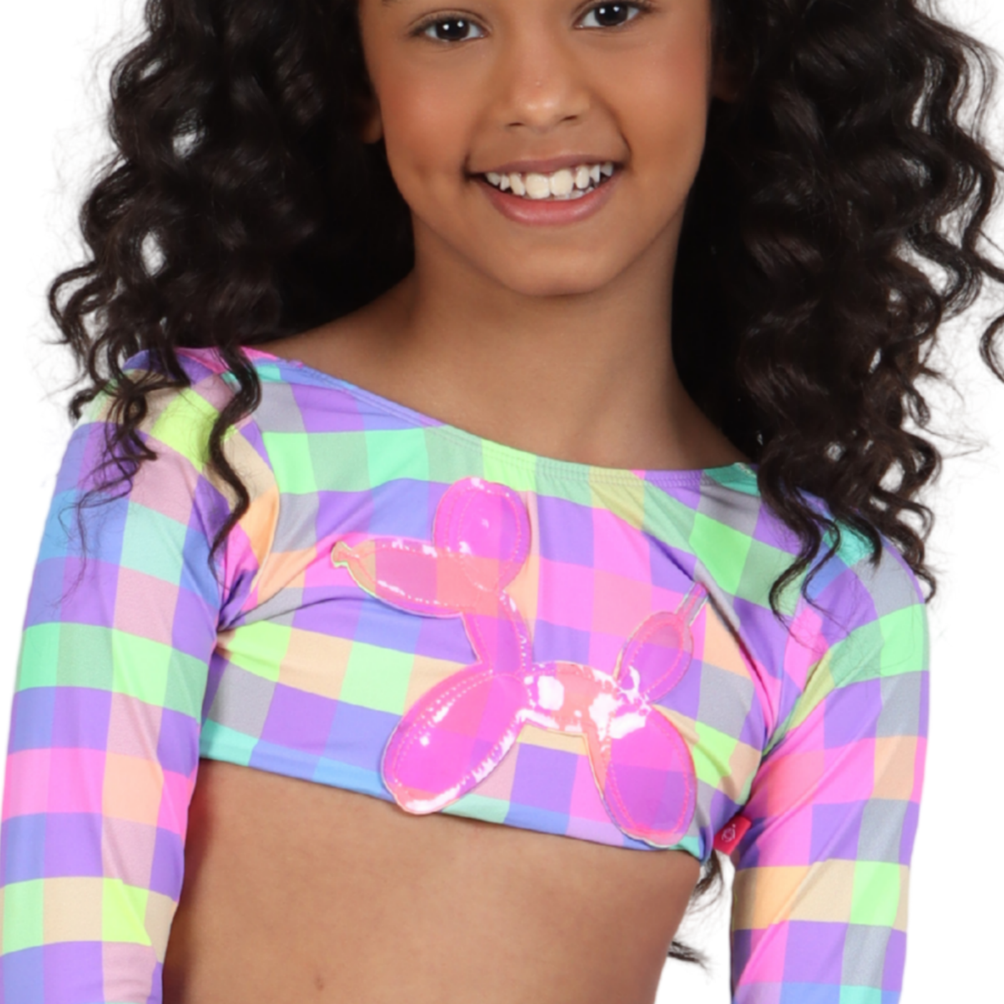 O top modelo cropped de manga longa conta com um adorável aplique de balão em formato de cachorrinho, trazendo um toque lúdico e criativo.