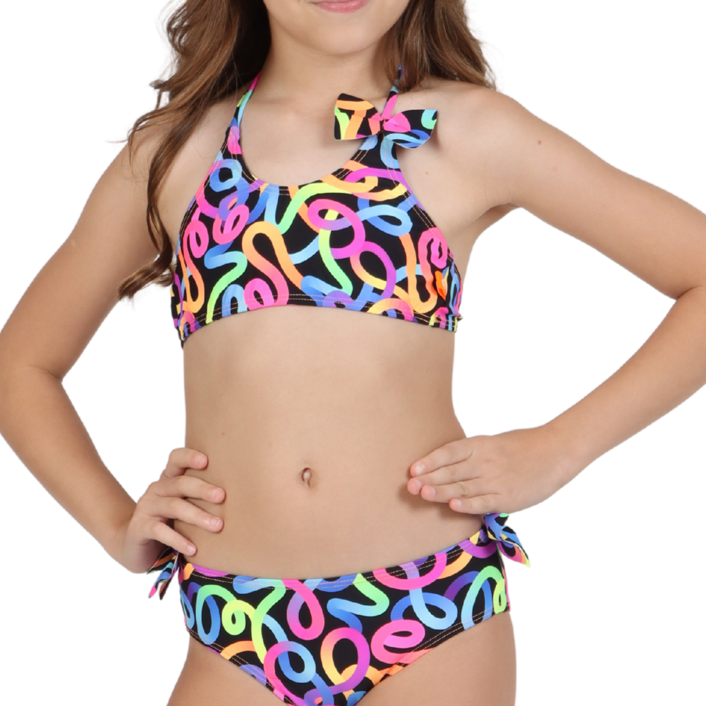 Com uma estampa vibrante e cheia de laços coloridos, ele traz o espírito alegre da estação em um visual moderno e encantador — perfeito para meninas que amam brincar e se destacar na praia ou na piscina.