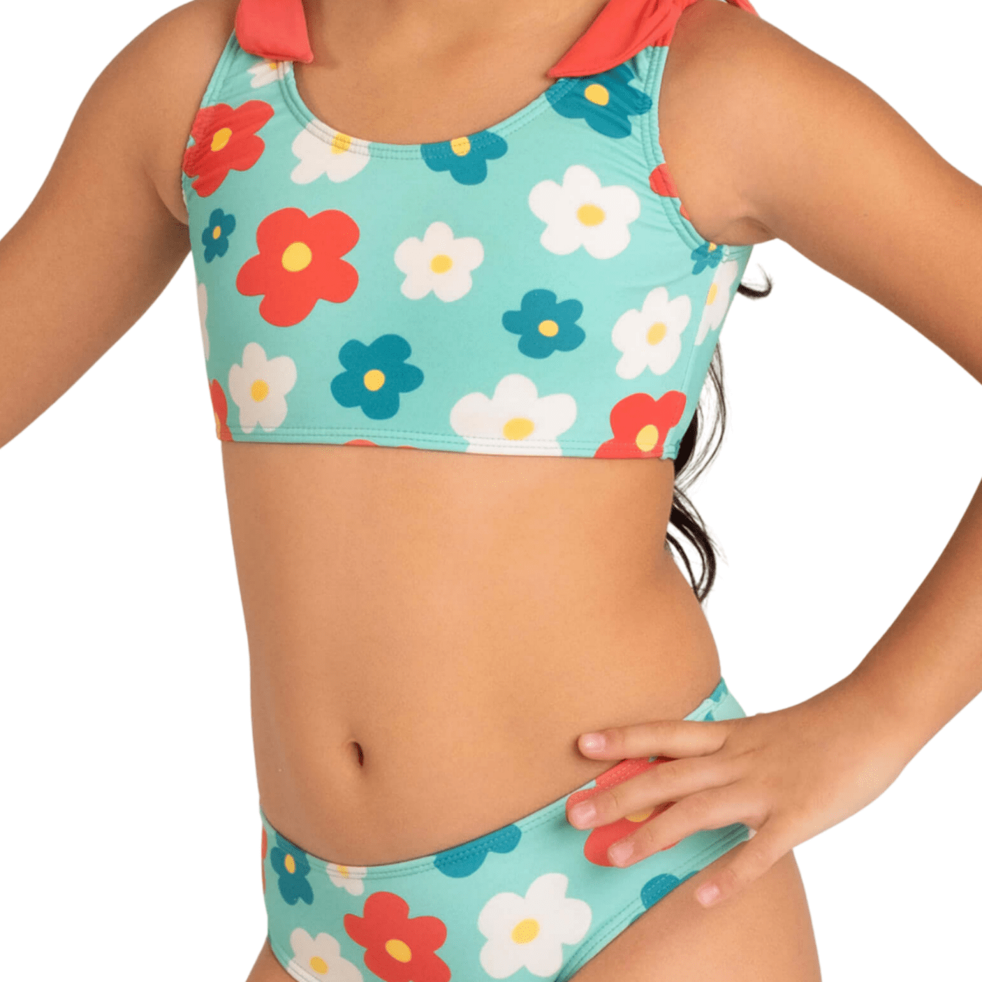 O conjunto traz top com amarrações nos ombros, que além de fofo, permite ajuste perfeito ao corpo, e calcinha com modelagem confortável que se adapta aos movimentos das crianças. O tecido leve, elástico e de secagem rápida proporciona um toque macio e fresquinho, ideal para brincar e se movimentar sem restrições.