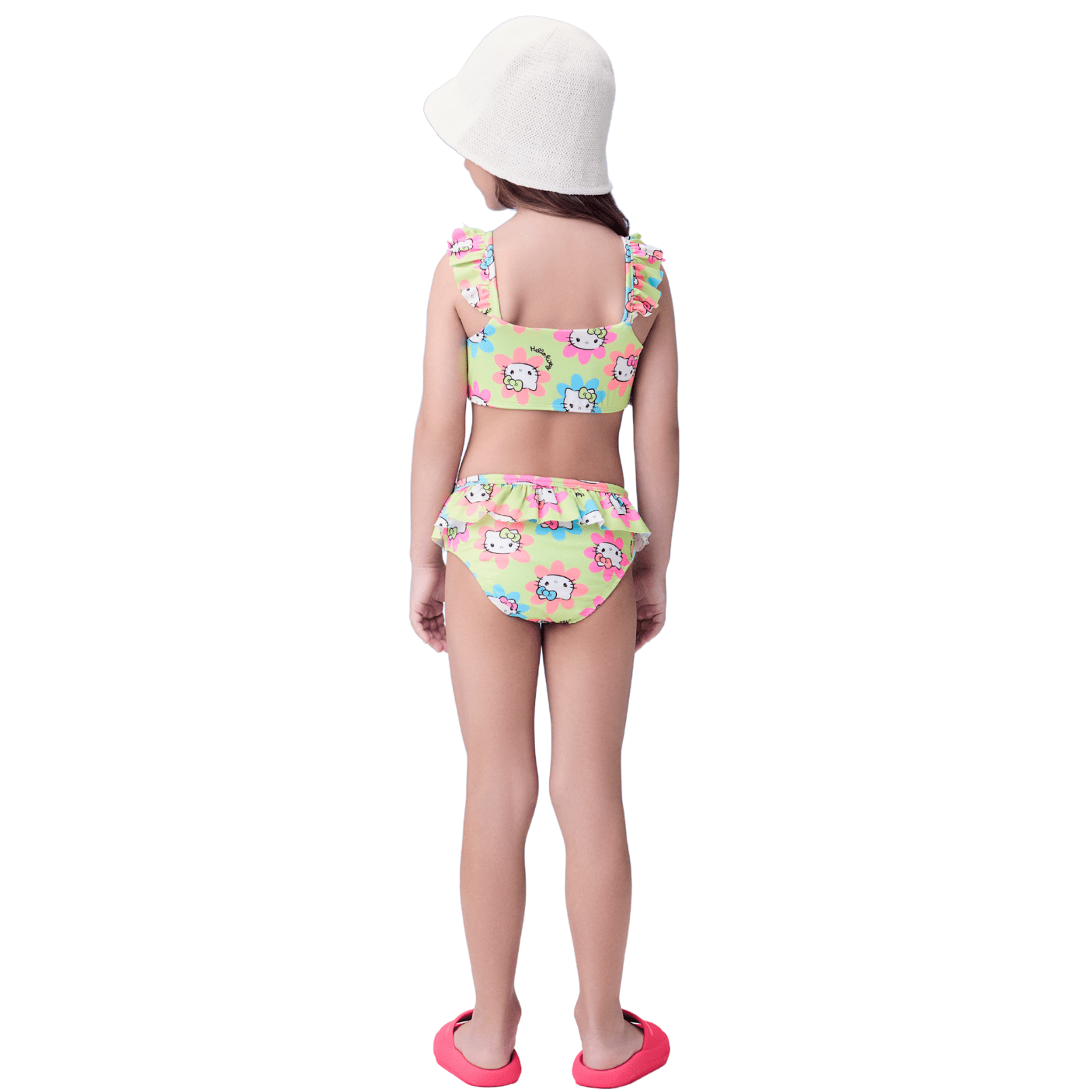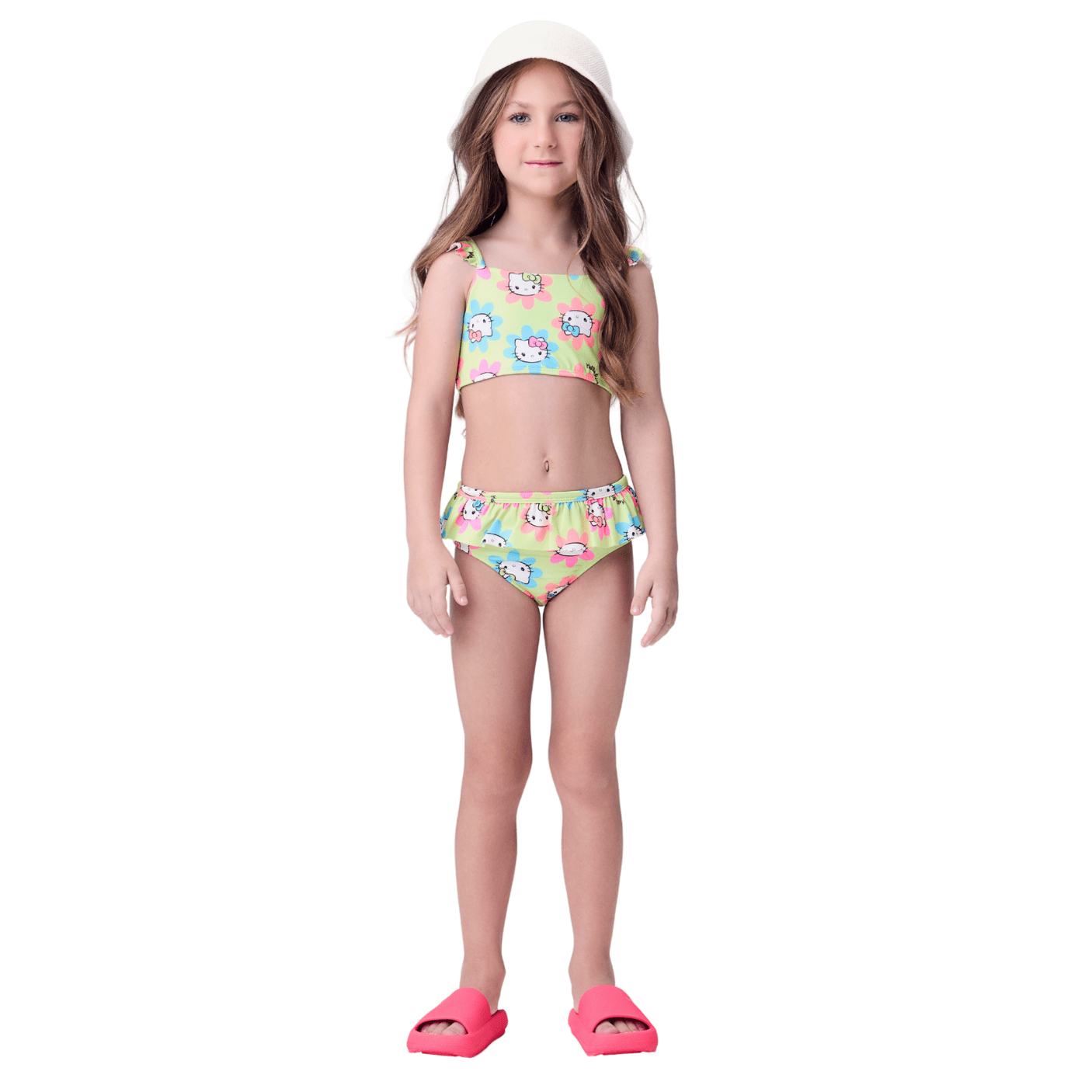 O Biquíni Hello Kitty Flores Verde Momi é o look perfeito para as pequenas aproveitarem o verão com muito estilo e segurança! Com estampa exclusiva da Hello Kitty entre flores coloridas, ele combina proteção solar, conforto e um toque encantador que é a cara da temporada.