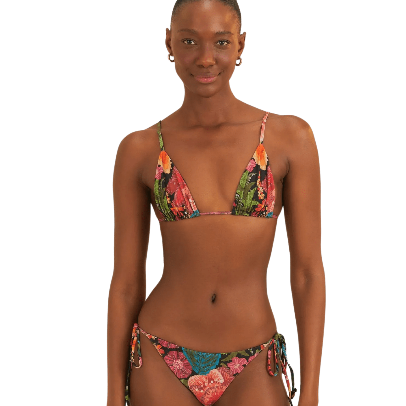 A calcinha com lacinhos laterais ajustáveis permite um encaixe personalizado e confortável, adaptando-se perfeitamente ao corpo. A estampa exclusiva “Bordadeira”, rica em cores e detalhes inspirados em bordados manuais, traz um toque autêntico e artístico à peça — refletindo toda a essência criativa da FARM Rio.
