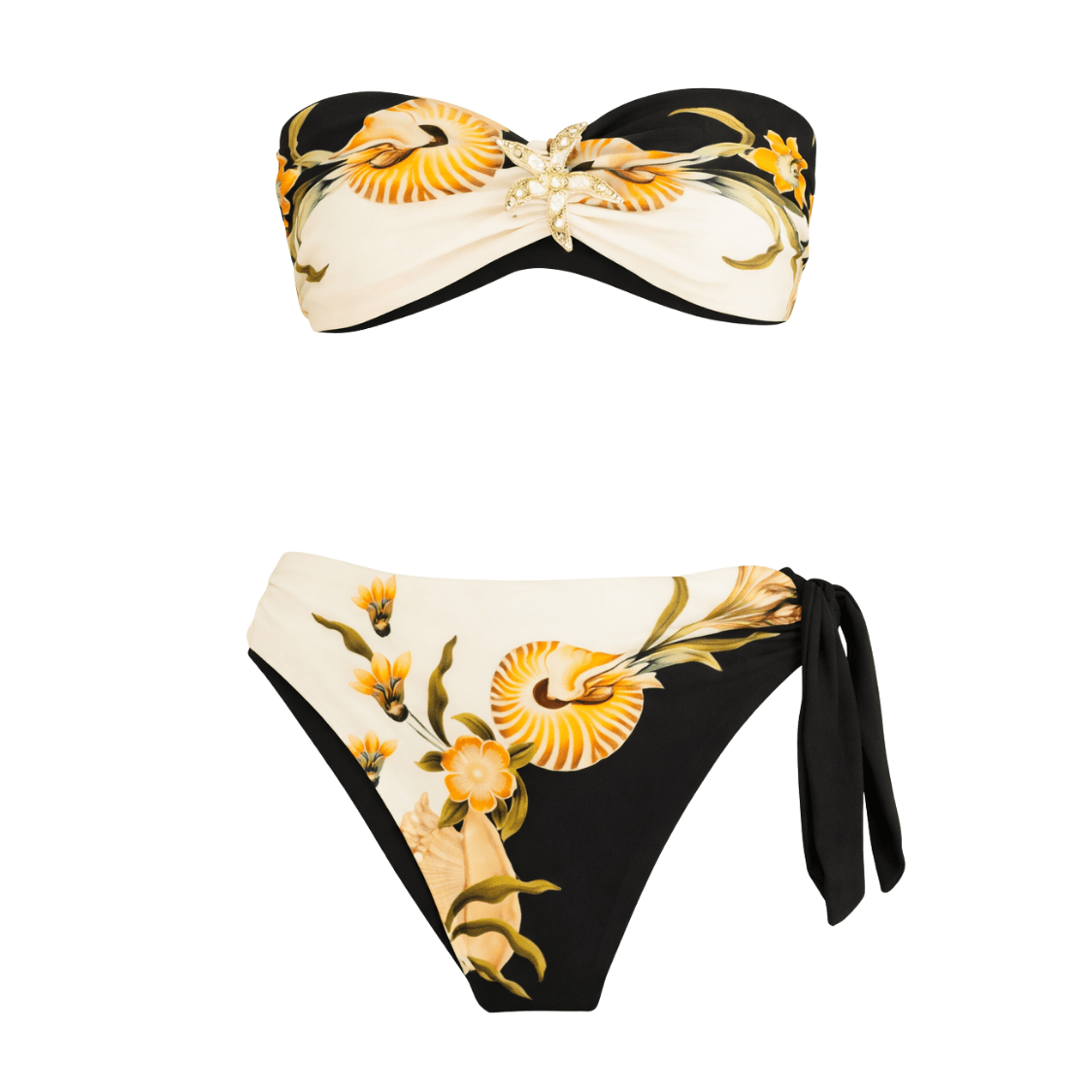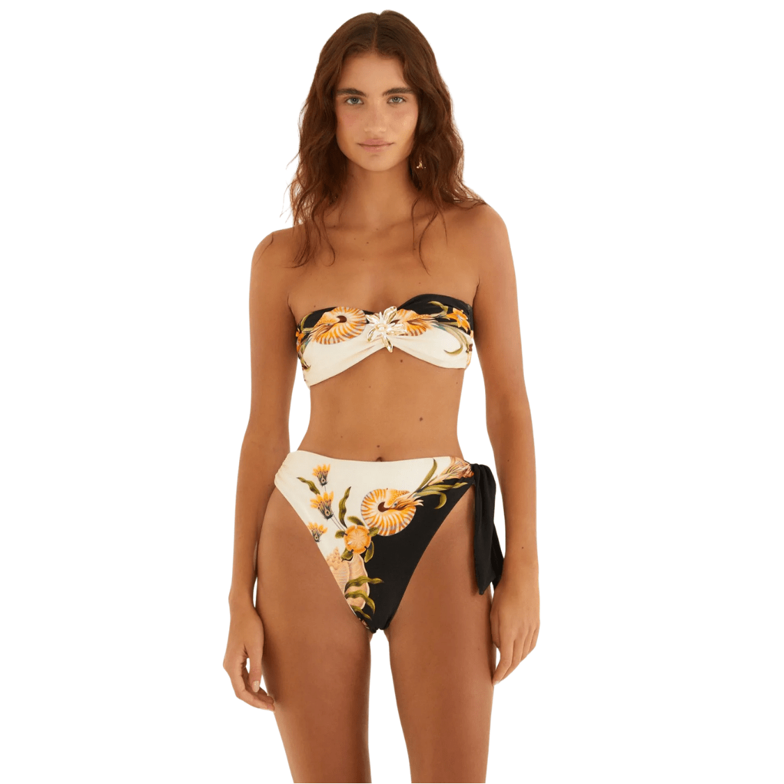 O Biquíni Localizado Fivela Concha Surreal Farm combina estampa exclusiva com modelagem moderna e acabamento sofisticado. A composição bicolor em preto e off white, junto à arte localizada de conchas e elementos naturais, cria um visual marcante e elegante.