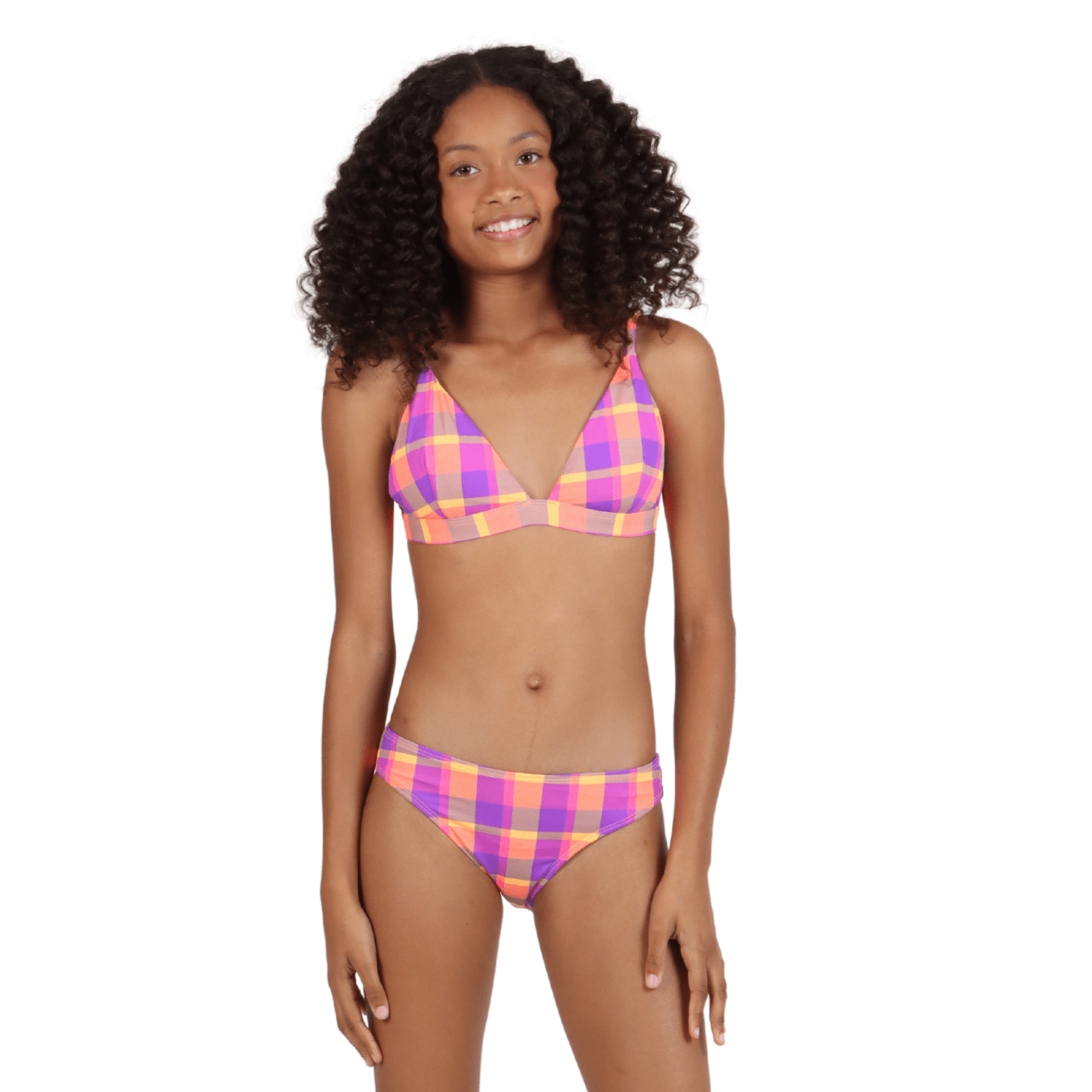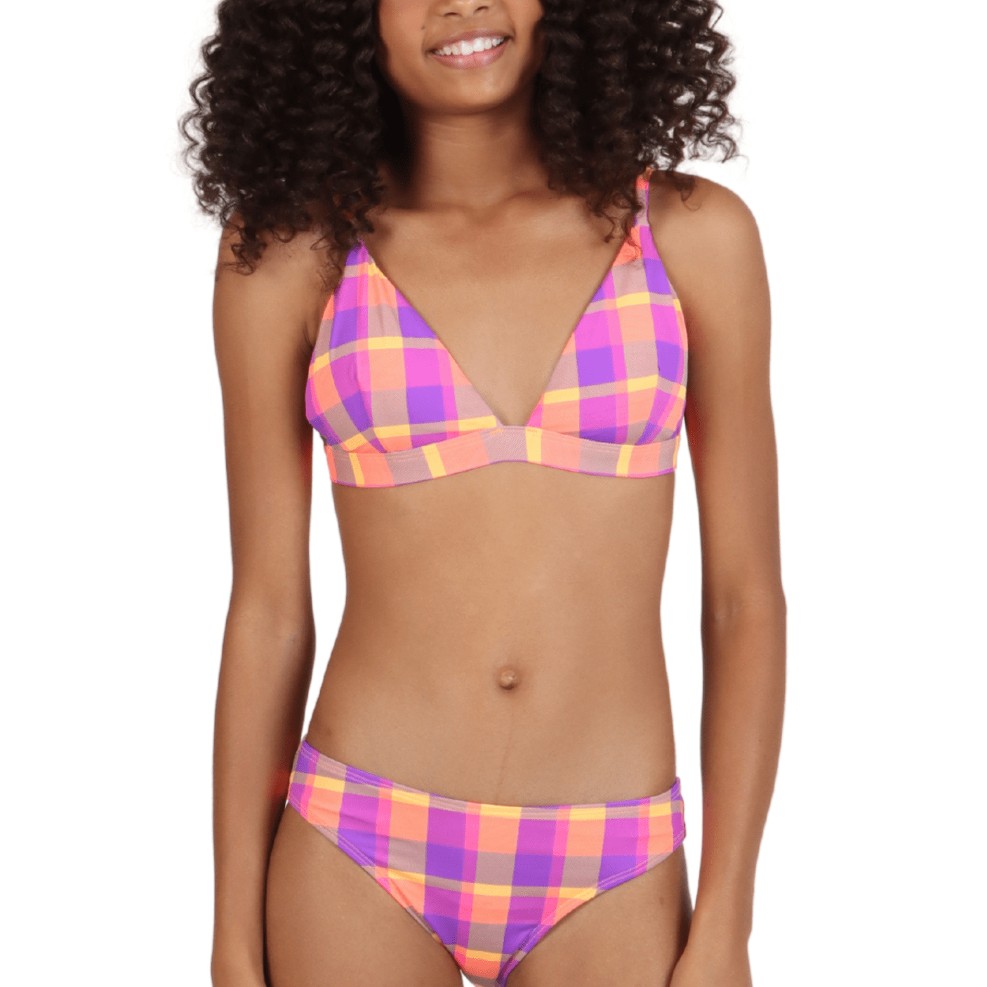 O top modelo cortininha conta com alças ajustáveis e bojo removível, proporcionando melhor sustentação e adaptação ao corpo. Já a calcinha apresenta modelagem clássica, que oferece segurança, conforto e liberdade de movimentos. O grande destaque fica para a estampa xadrez em tons vibrantes de rosa, laranja e roxo, que traduz alegria, frescor e tendência, deixando o look jovem e cheio de personalidade.