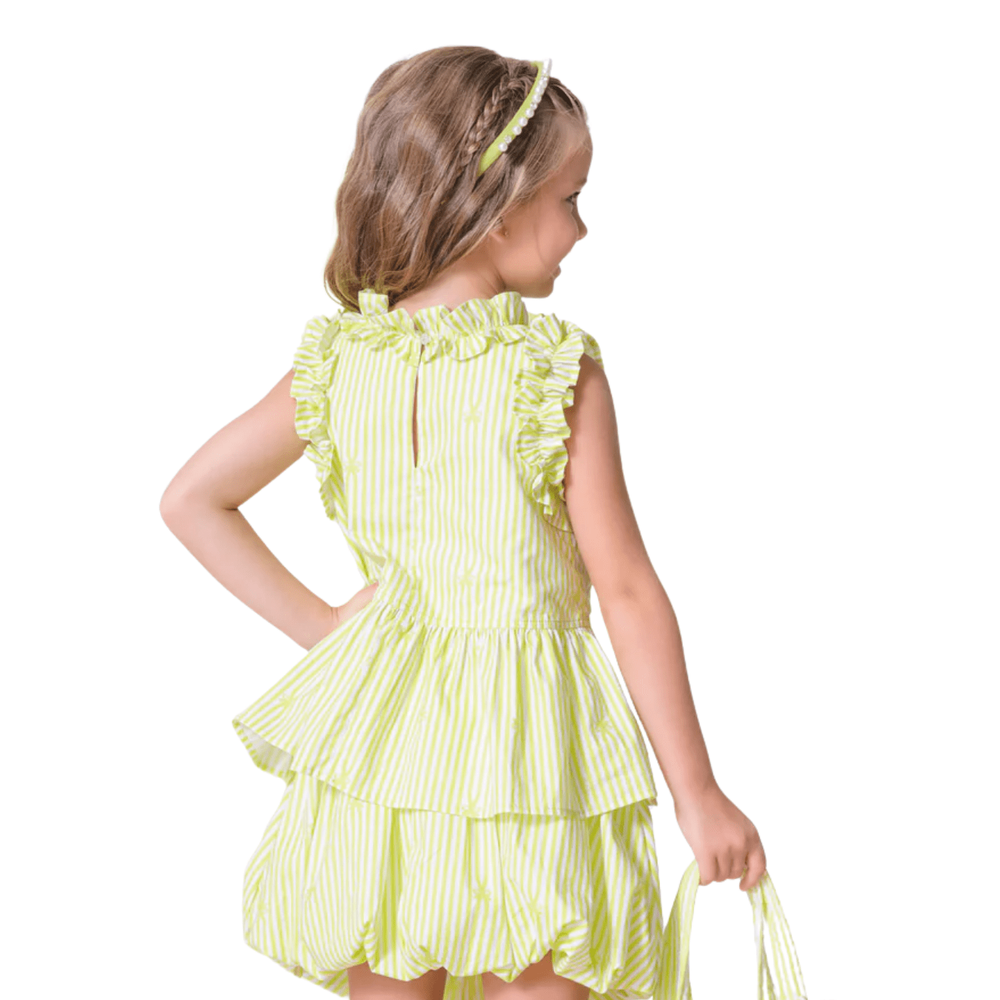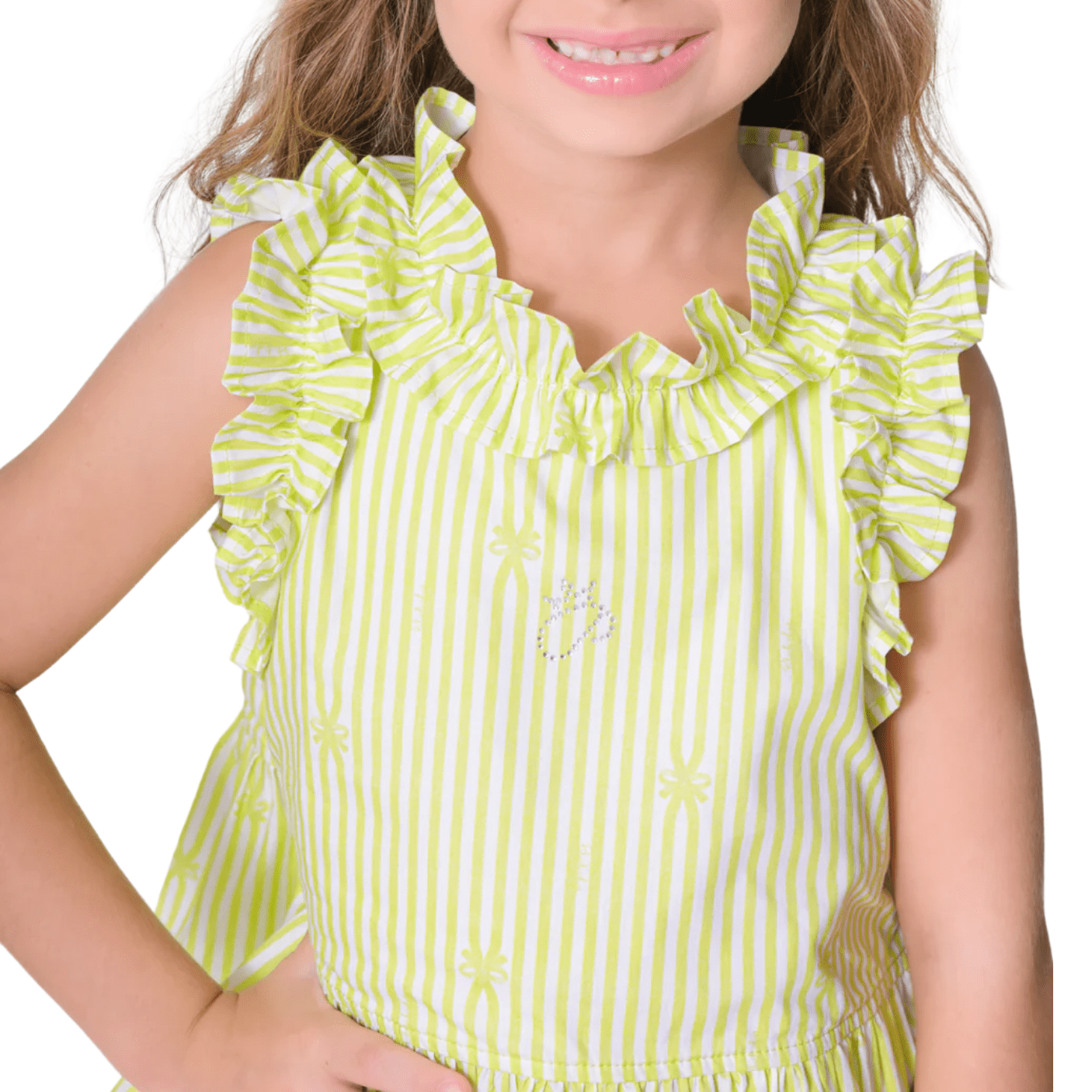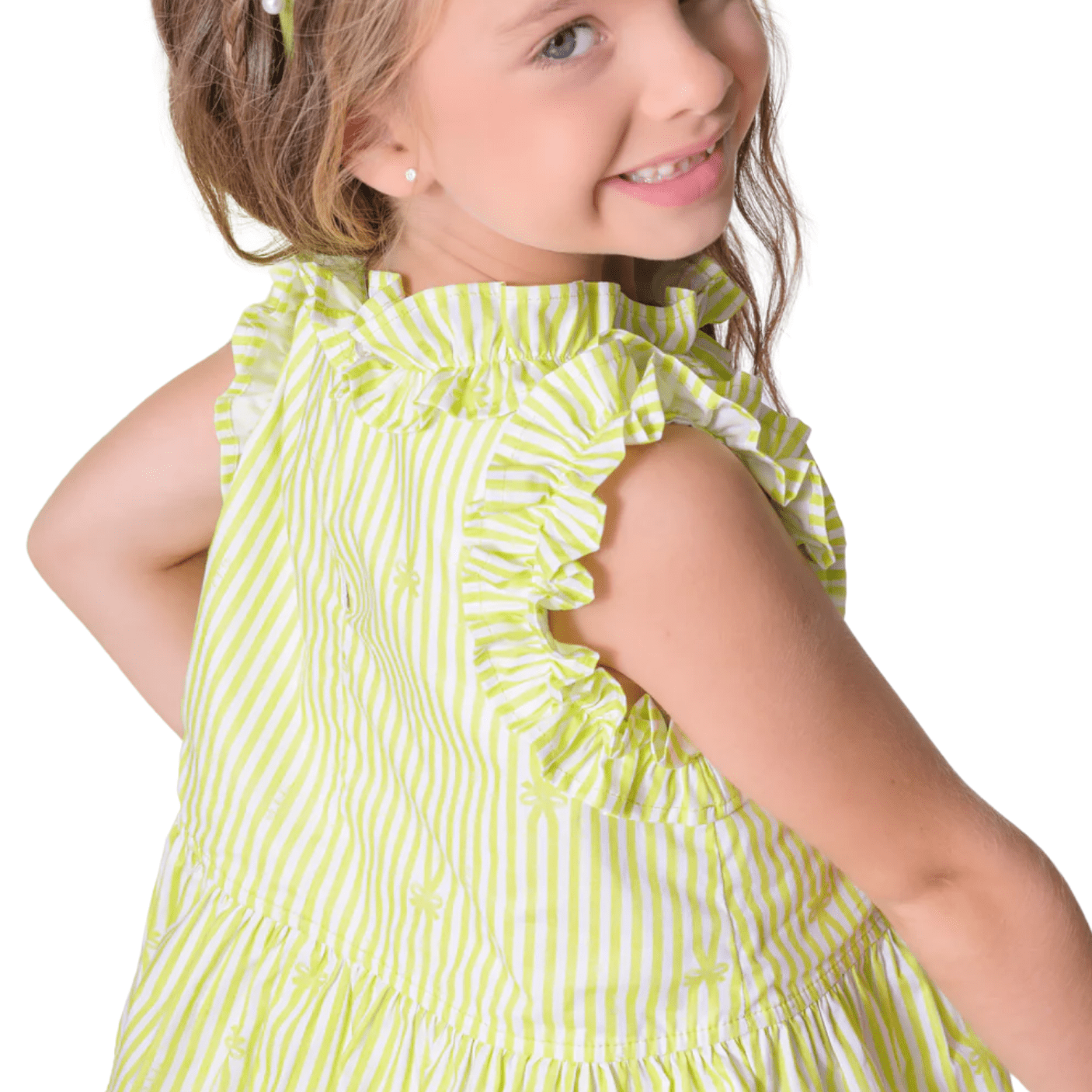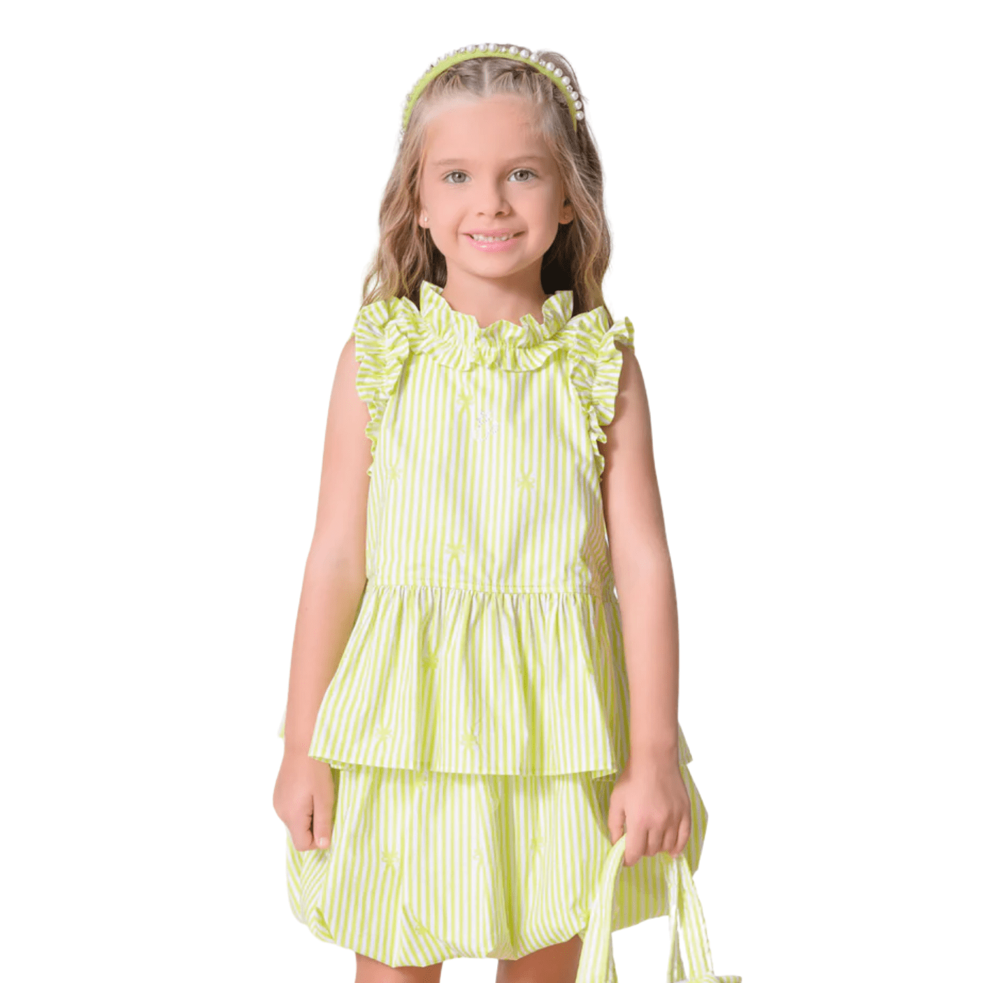 Feita em tricoline de algodão macio e leve, traz o frescor das listras em verde-claro e branco, perfeitas para os dias ensolarados e cheios de alegria.