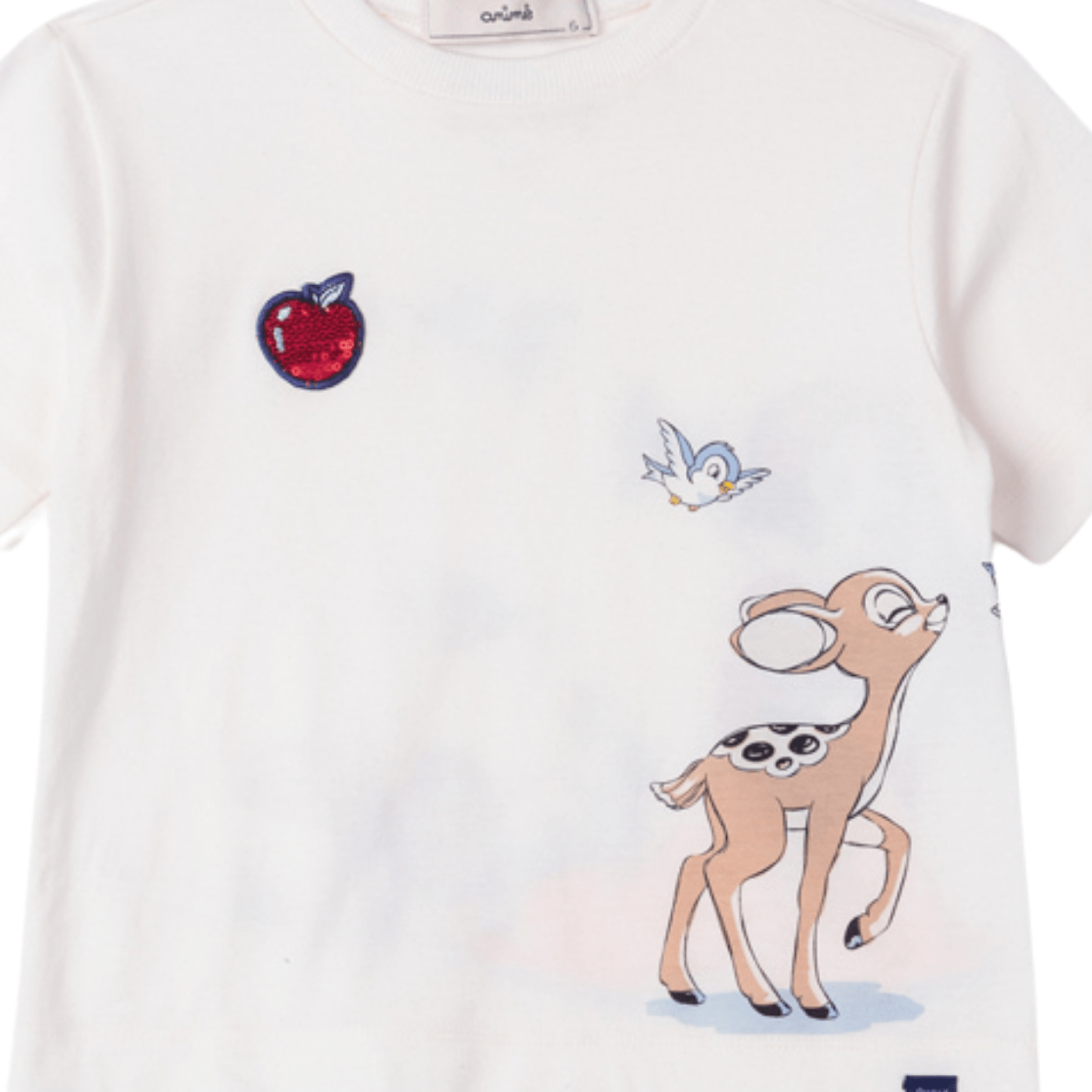 O destaque fica por conta da estampa exclusiva que retrata Branca de Neve ao lado de seus adoráveis amigos da floresta, transmitindo ternura e encantamento a cada detalhe. No centro da composição, o icônico símbolo da história — a maçã — ganha vida através de um bordado elaborado com paetês brilhantes, adicionando um toque glamouroso e sofisticado ao look.