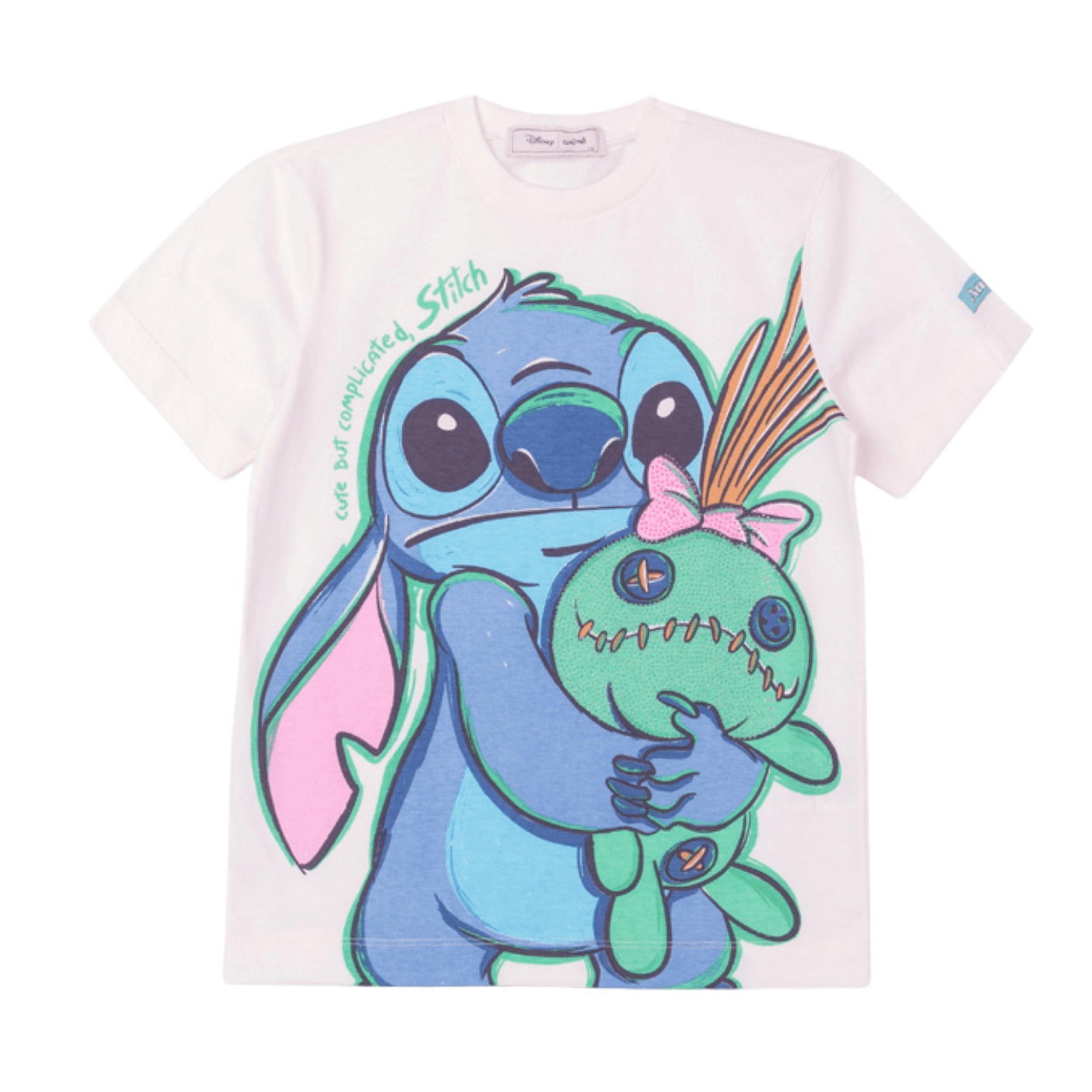 Um dos grandes destaques da peça é a frase "Cute but Complicated", que aparece ao lado do nome do Stitch. Essa mensagem divertida reflete o jeitinho único e expressivo do personagem, conquistando fãs de todas as idades — especialmente as meninas que adoram um look cheio de atitude.