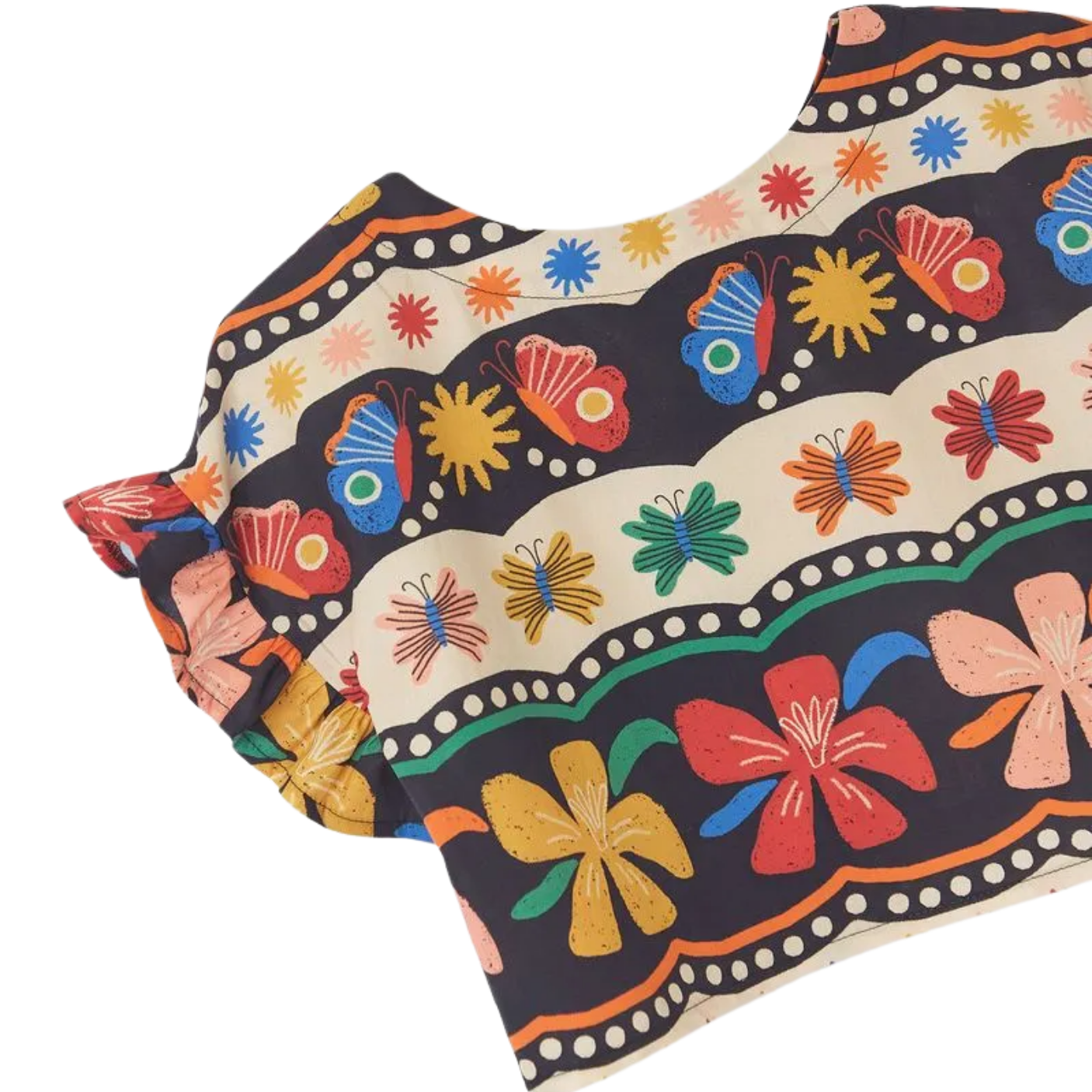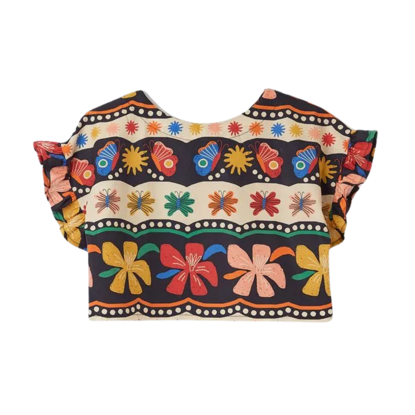 O design encantador apresenta decote em U, que valoriza o colo de forma sutil, além de mangas curtas com babado, que conferem movimento e um ar romântico à peça. As costuras em tom vibrante criam um contraste alegre e divertido, perfeito para quem ama looks cheios de personalidade.