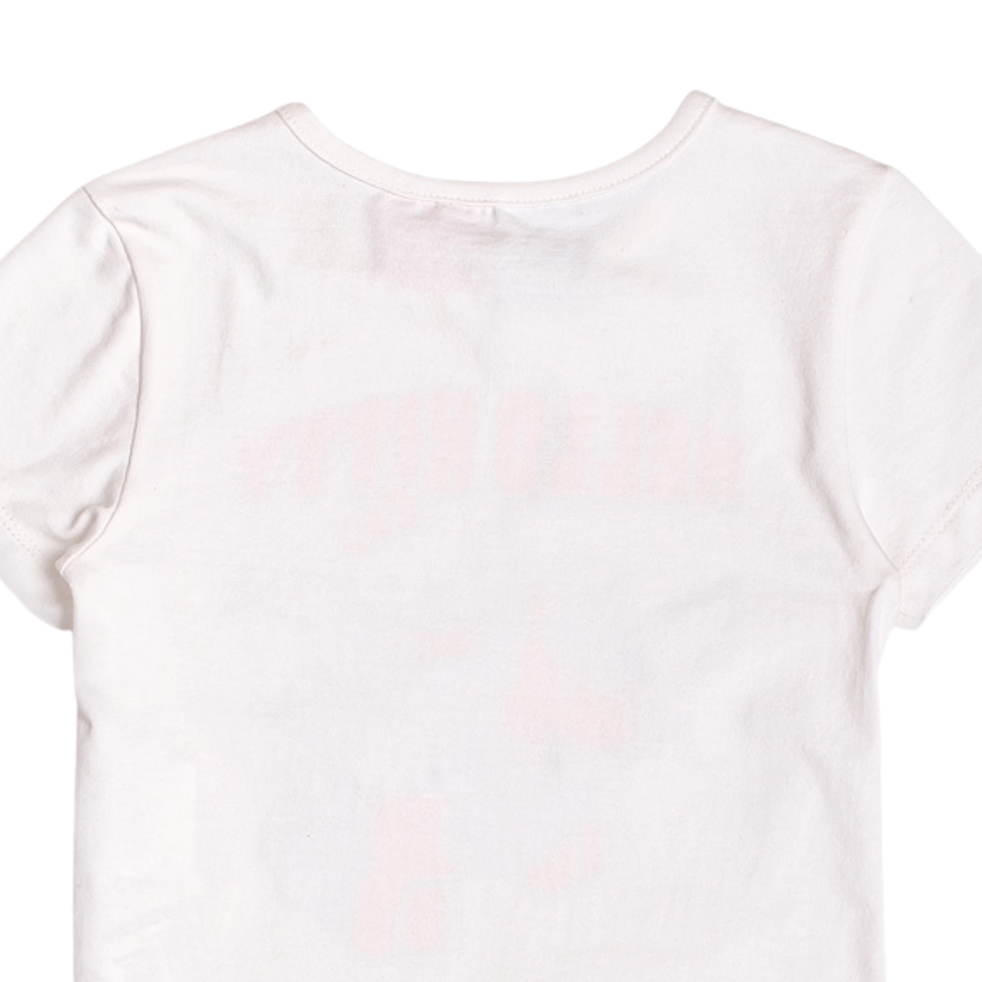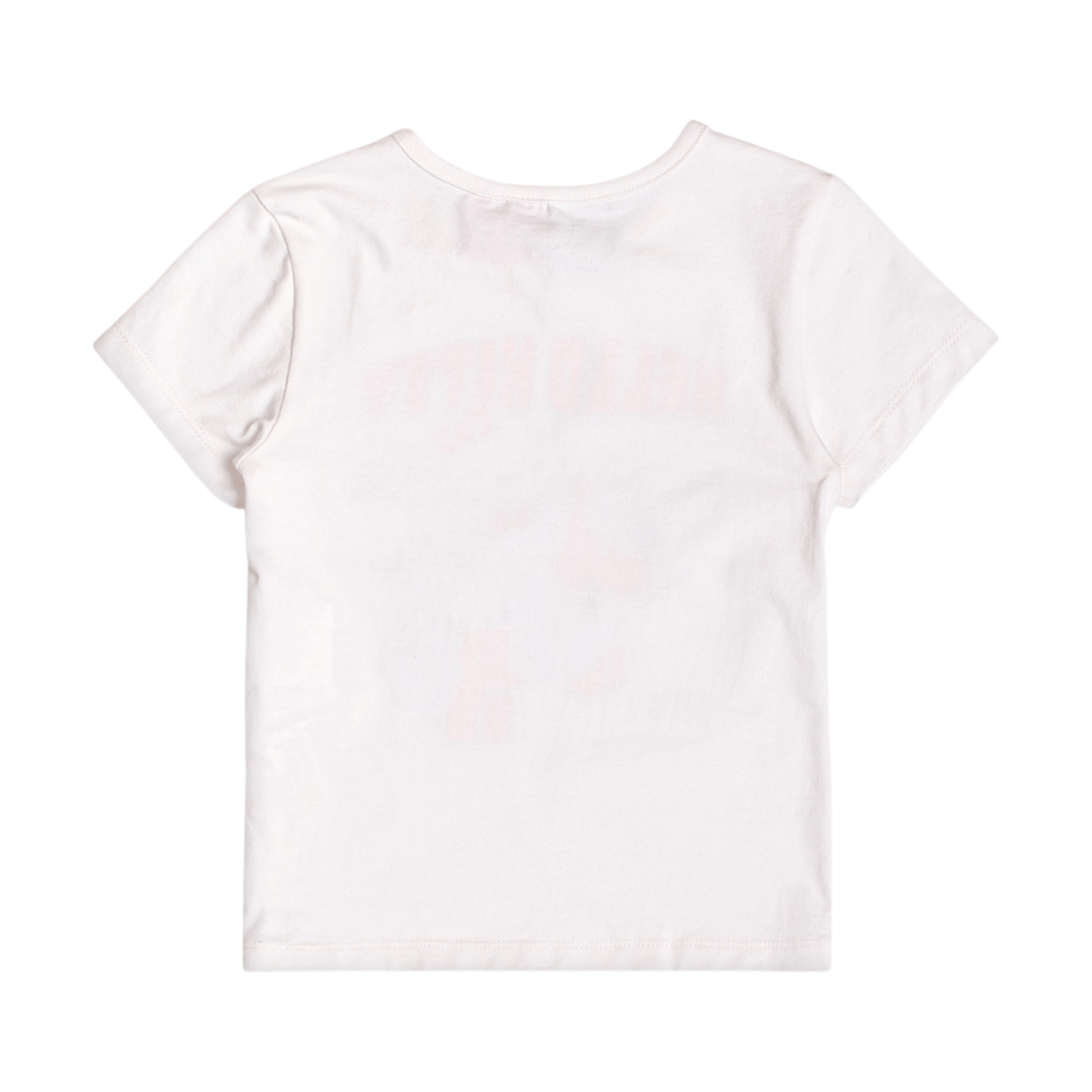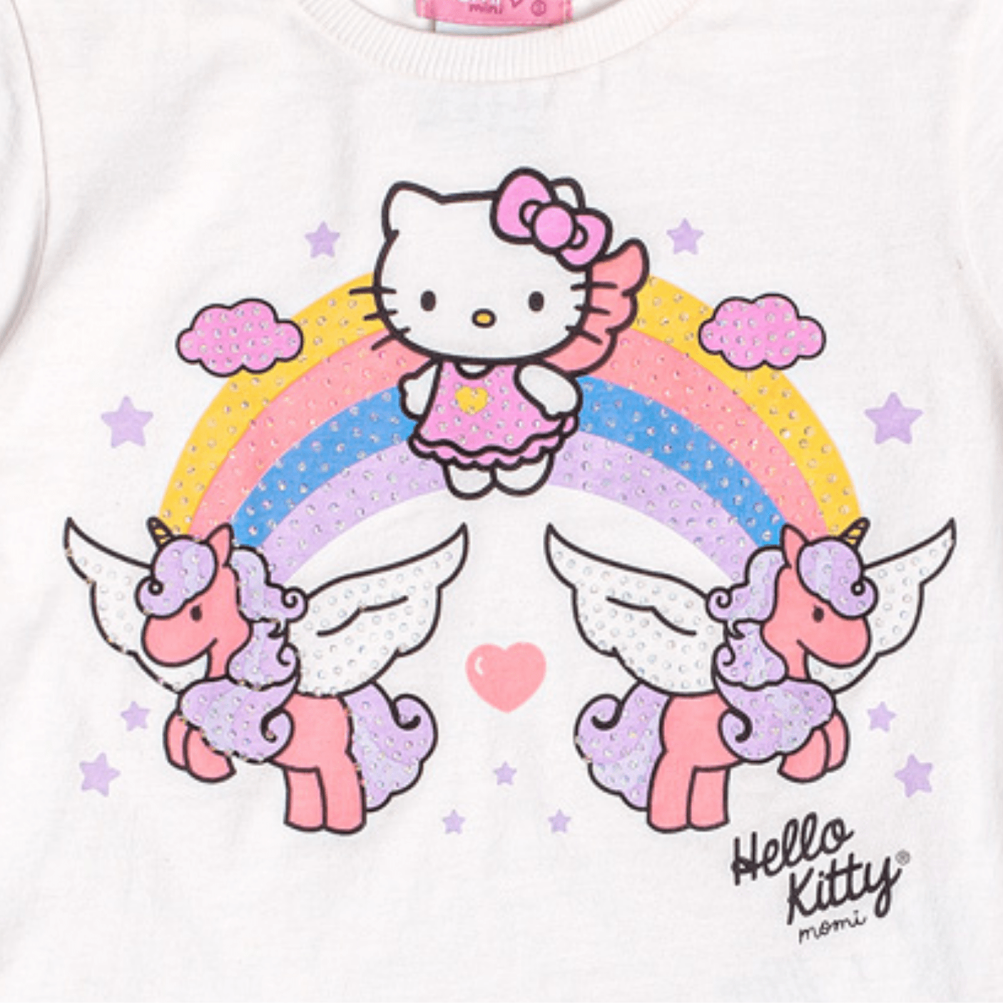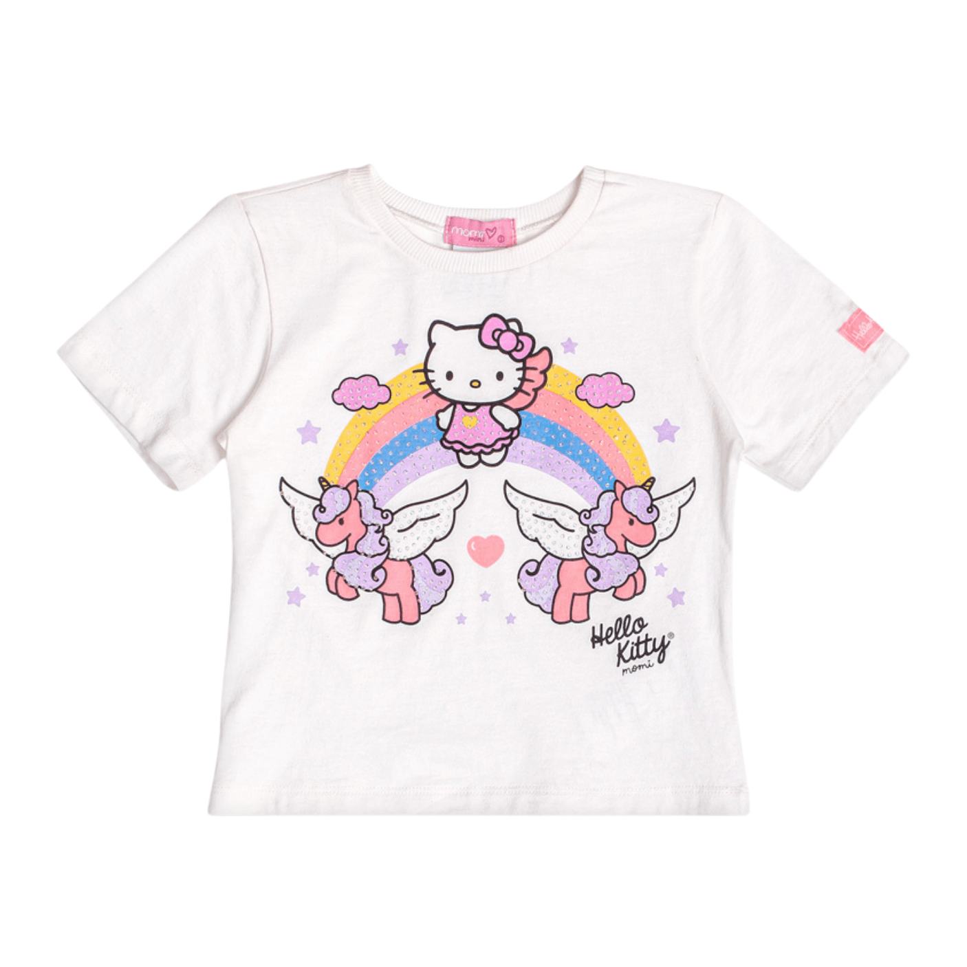 O destaque fica por conta da estampa vibrante da Hello Kitty segurando um arco-íris, criando uma composição alegre, cheia de cores e com aquele toque especial de fofura que encanta crianças e adultos. É a peça perfeita para compor looks casuais com shorts, saias, leggings ou calças, permitindo múltiplas combinações.