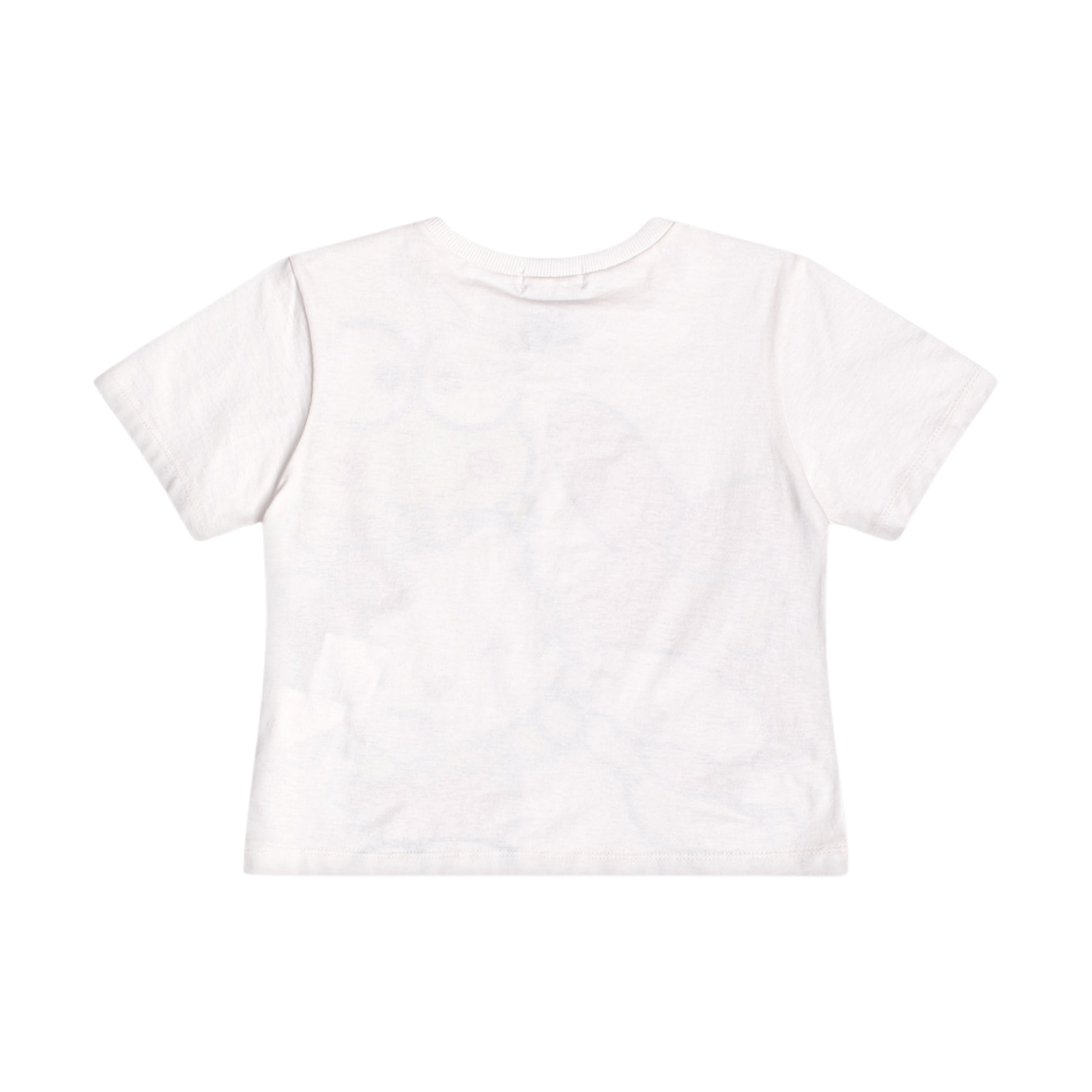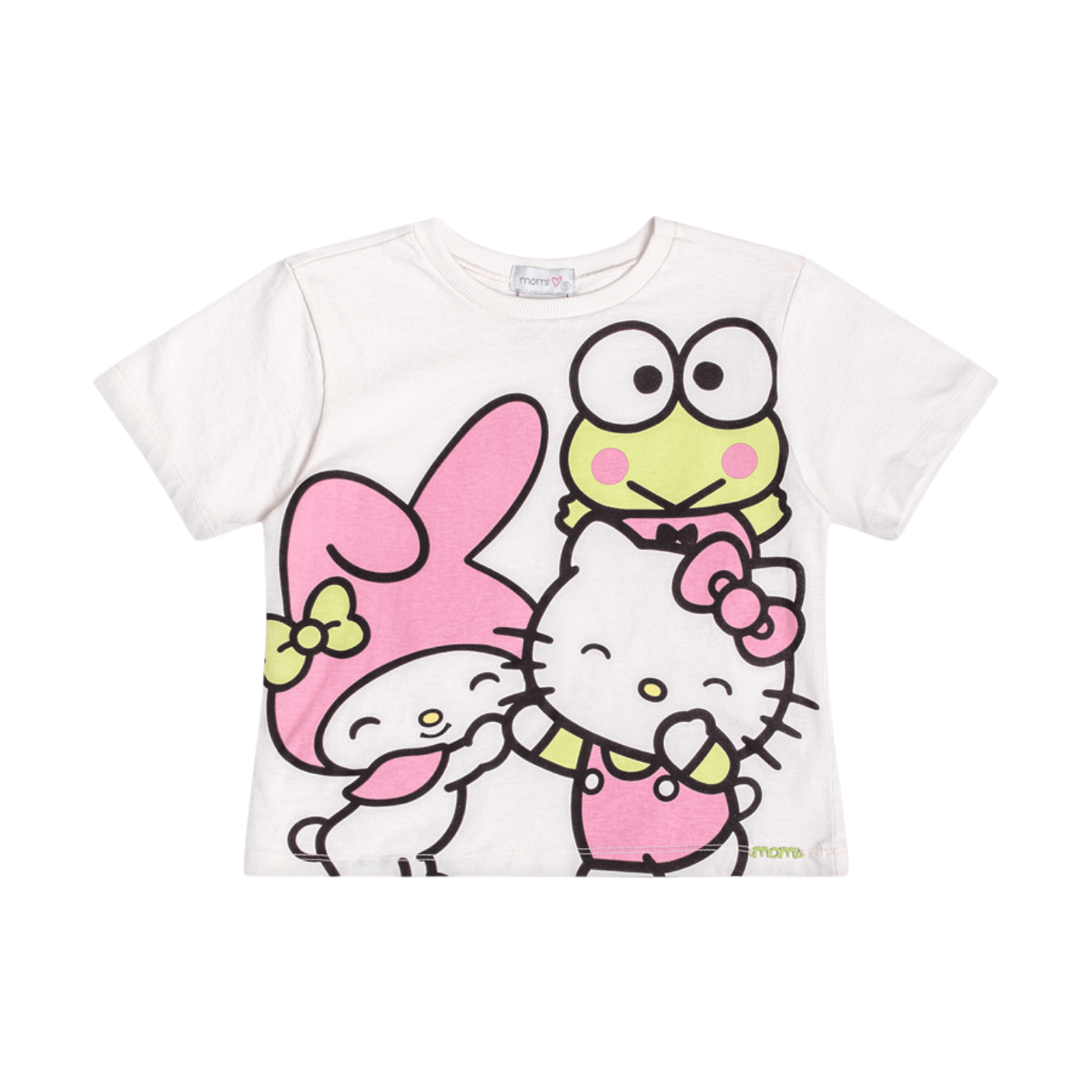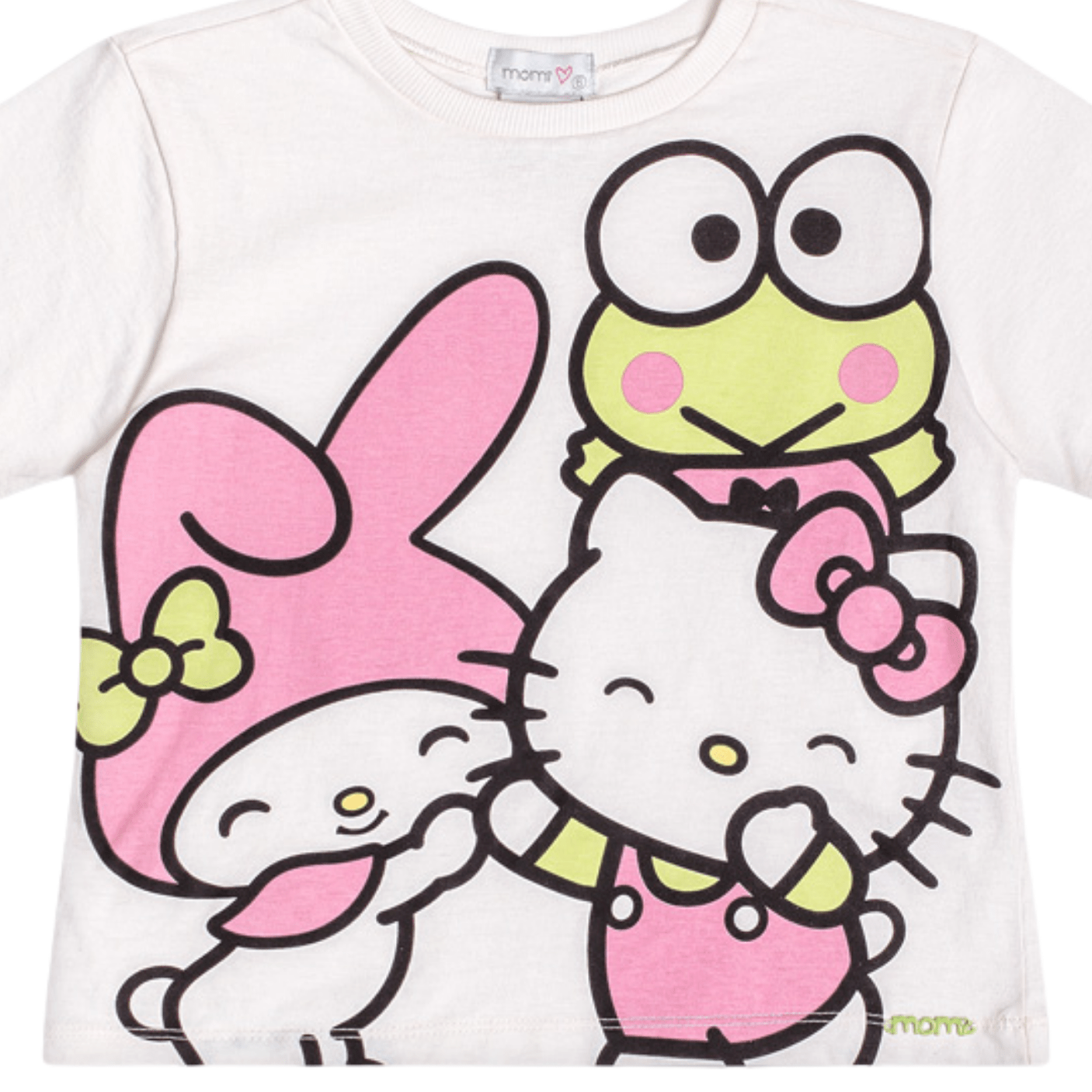 O modelo apresenta mangas curtas e gola redonda, oferecendo praticidade e frescor. O destaque fica por conta da estampa exclusiva que traz personagens icônicos da Sanrio: Hello Kitty, My Melody e Keroppi, em cores vibrantes e alegres que deixam a peça ainda mais encantadora e cheia de personalidade.