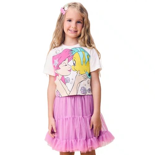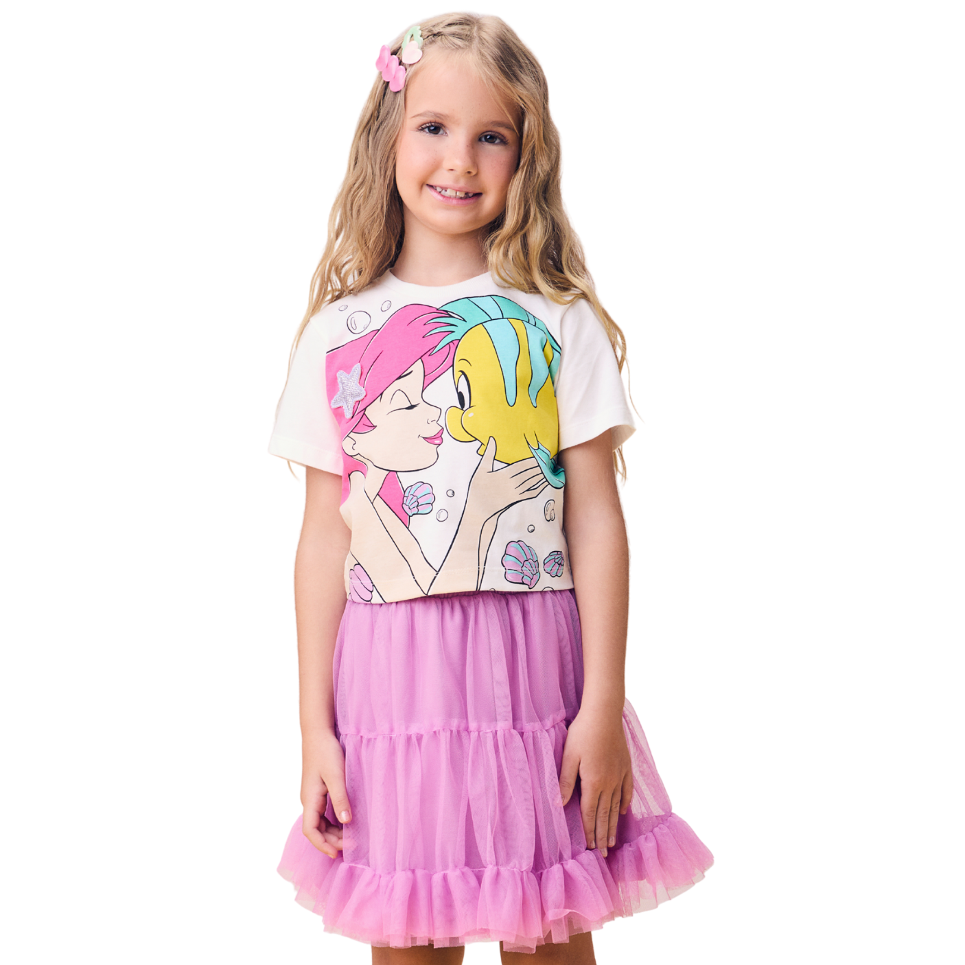 O grande destaque está na estampa maxi da princesa Ariel ao lado de seu inseparável amigo Linguado, que transmite fantasia e diversão. Para completar, a peça conta com a aplicação de uma estrela com glitter prateado, adicionando brilho na medida certa e deixando o visual ainda mais especial.