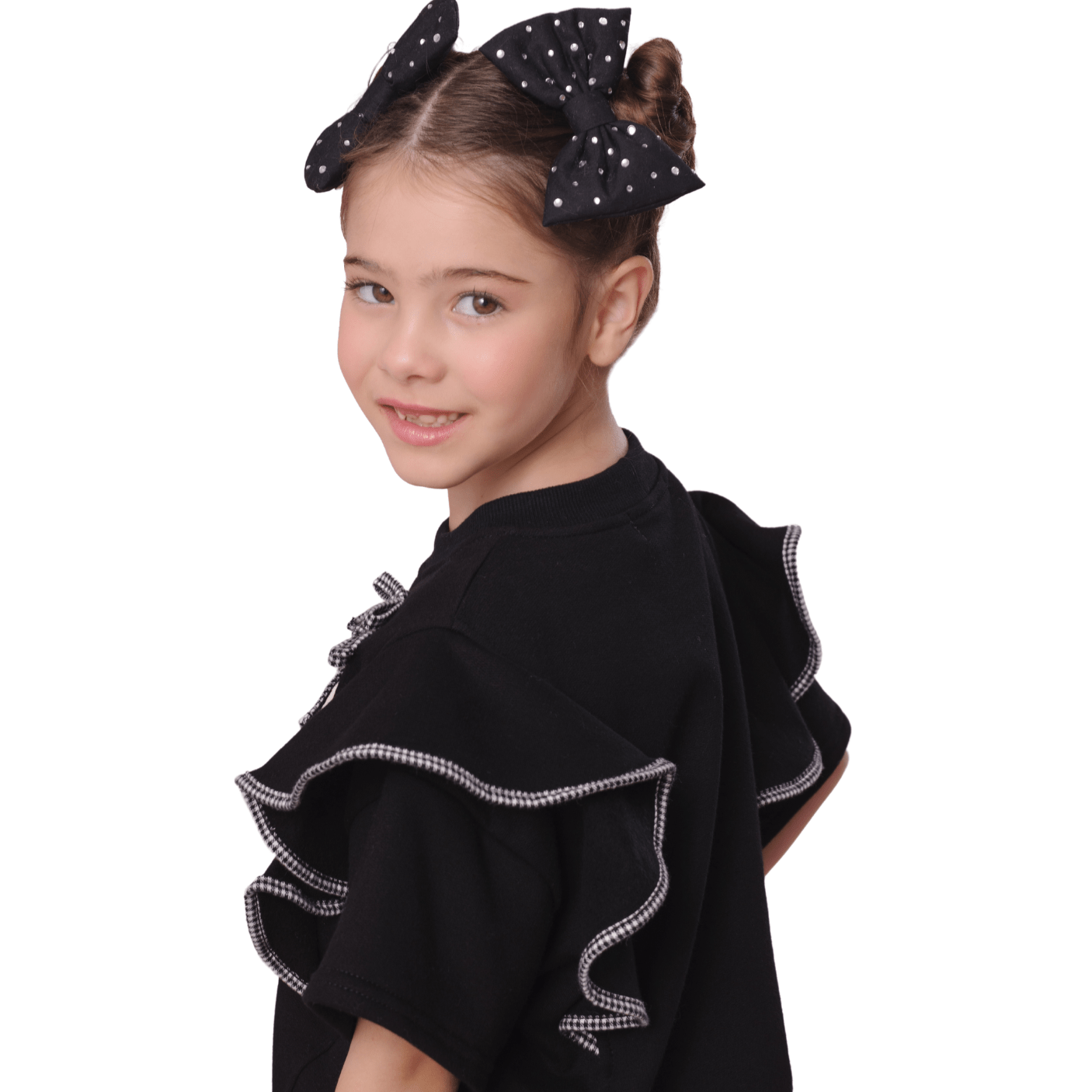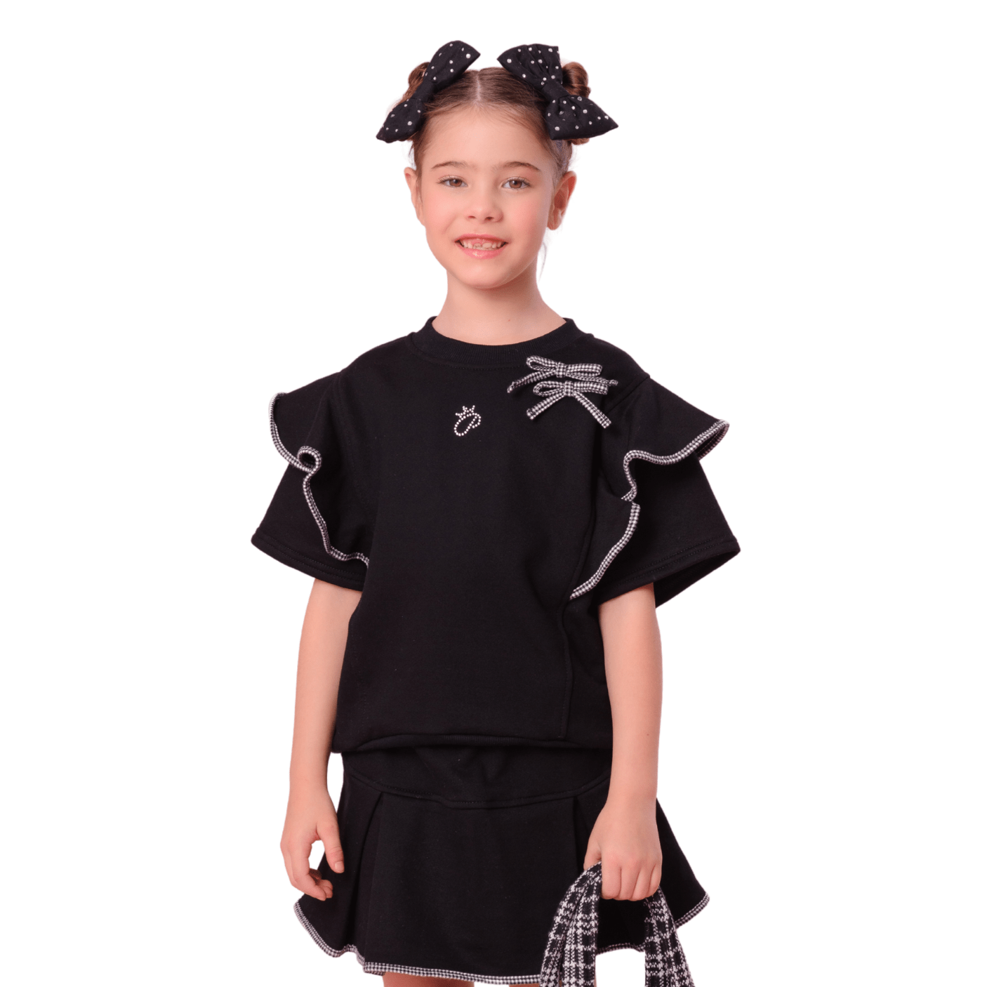 Com gola redonda e mangas curtas, o modelo é ideal para os dias de meia-estação ou para compor sobreposições estilosas. Os babados delicados com acabamento em debrum trazem um ar romântico e sofisticado, enquanto os laços aplicados nas laterais garantem um toque especial que é marca registrada da Pituchinhus.