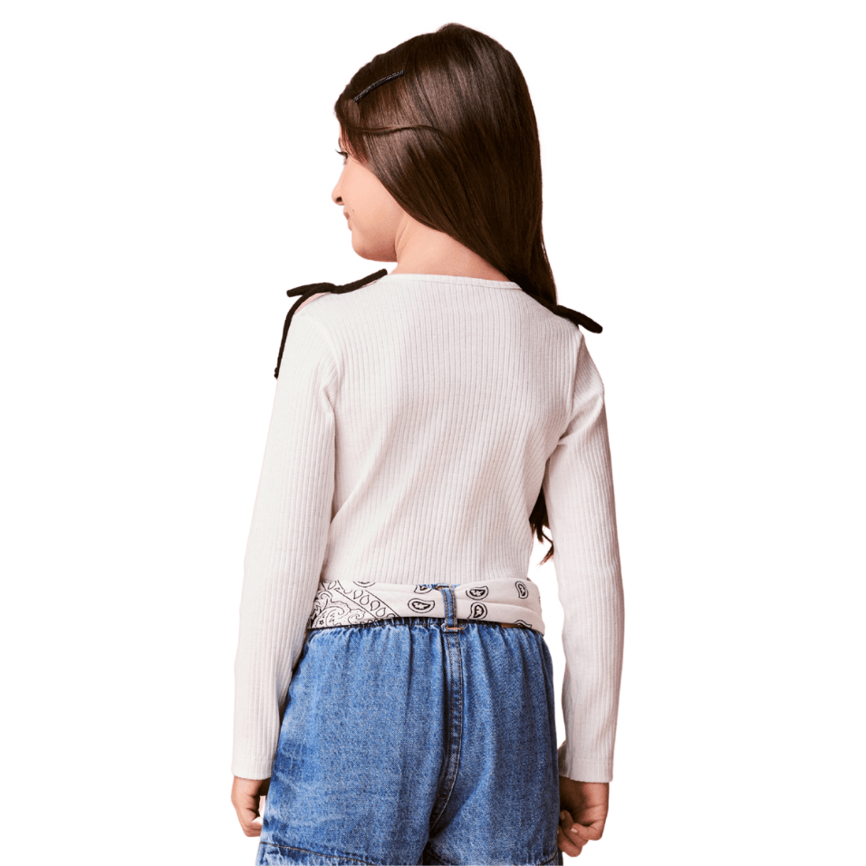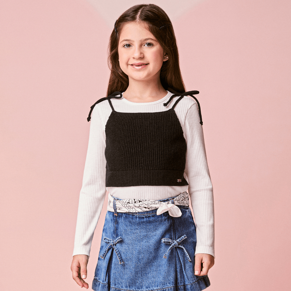 O modelo traz blusa em malha canelada off white com sobreposição de top em tricot preto, criando um efeito estiloso e contemporâneo. Os detalhes de amarração nos ombros adicionam charme extra e personalidade ao look.