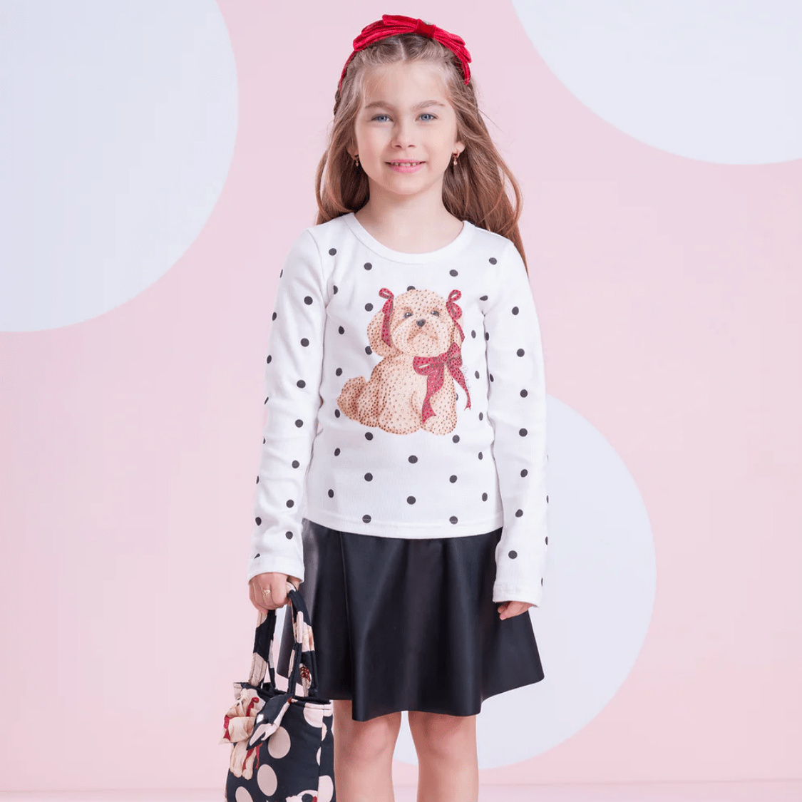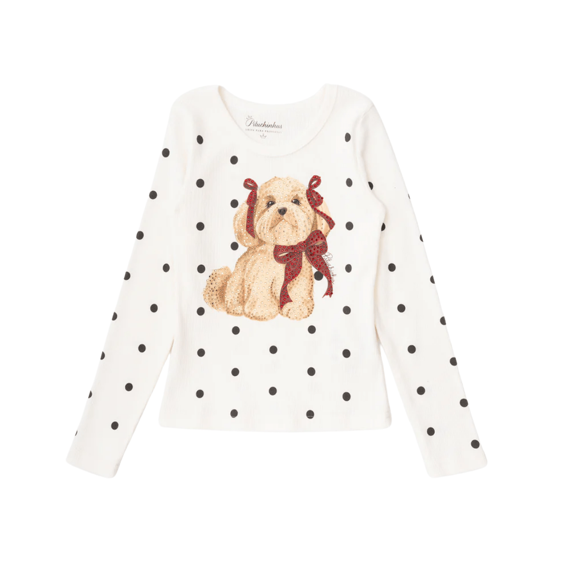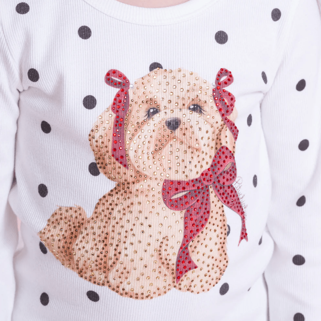 Confeccionada em ribana macia e confortável, a blusa possui modelagem ajustada, garantindo um caimento leve e aconchegante. A estampa de poá adiciona um toque atemporal, enquanto o cachorrinho em destaque com aplicação delicada traz um charme especial e divertido à peça.