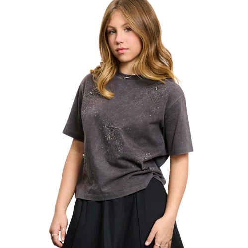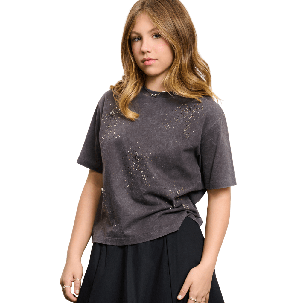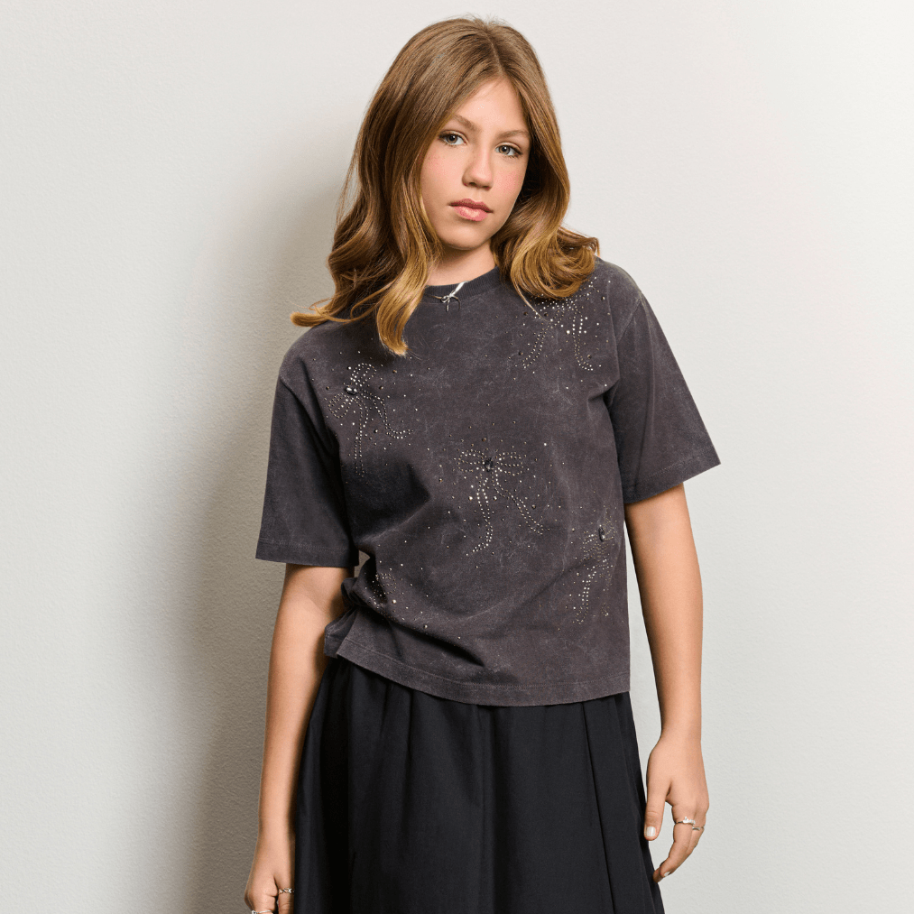 A Blusa T-Shirt Laço Pedraria Grafite Authoria é perfeita para meninas que amam um look moderno com um toque de brilho e sofisticação. Com design atual e detalhes delicados, ela traz personalidade e estilo para o dia a dia.