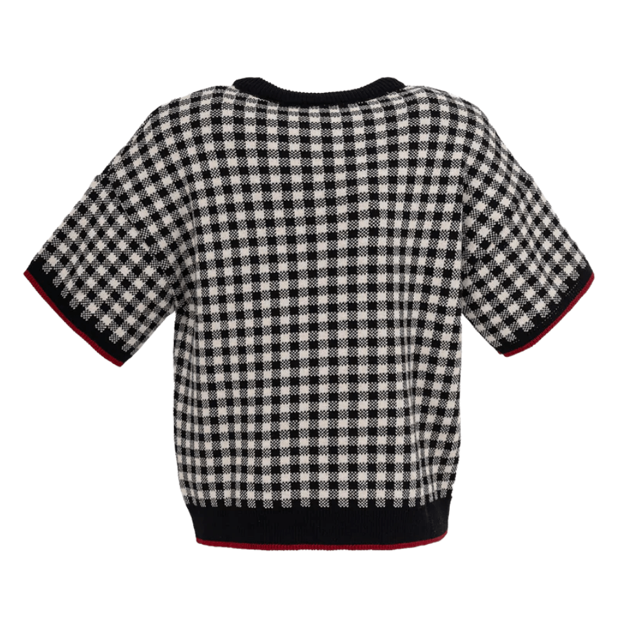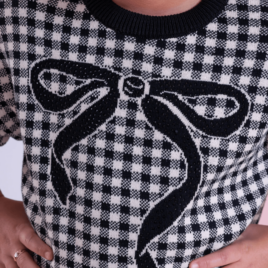 A Blusa Tricot Ampla Xadrez Laço Cristal Preto Pituchinhus é a união perfeita entre elegância clássica e charme moderno ✨