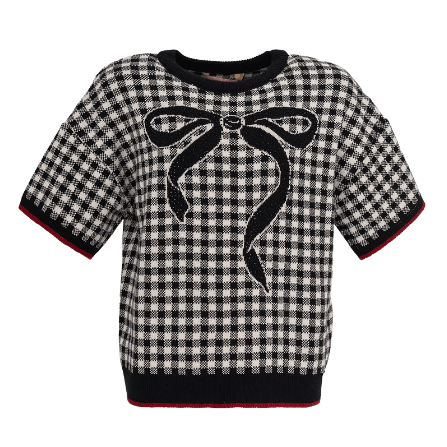 Com padronagem xadrez em preto e branco, a peça traz um visual atemporal e sofisticado. O grande laço frontal com aplicação em cristal adiciona brilho delicado e um toque especial à composição, traduzindo a essência refinada da marca.
