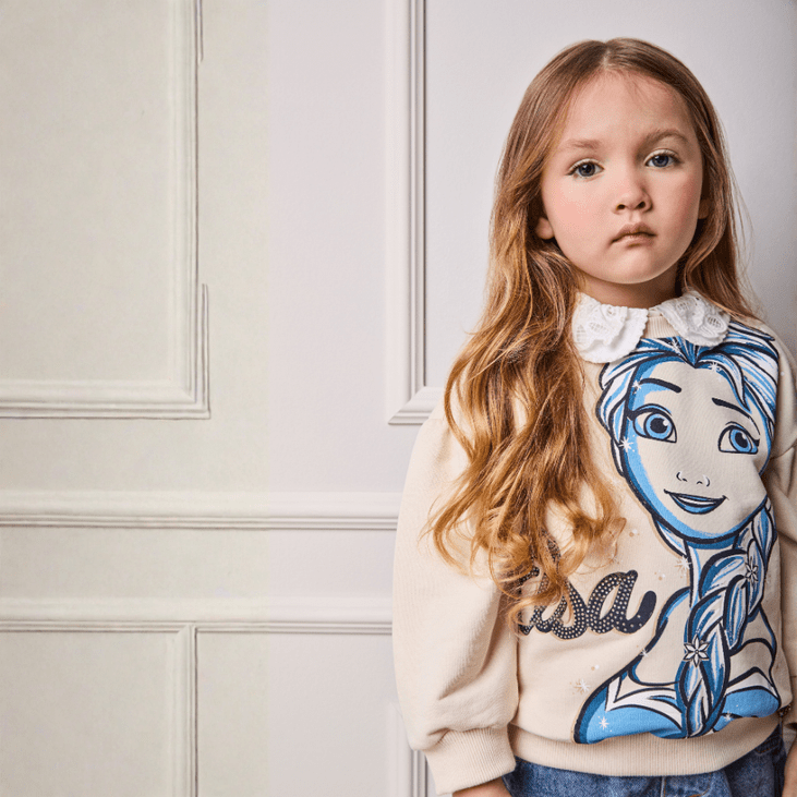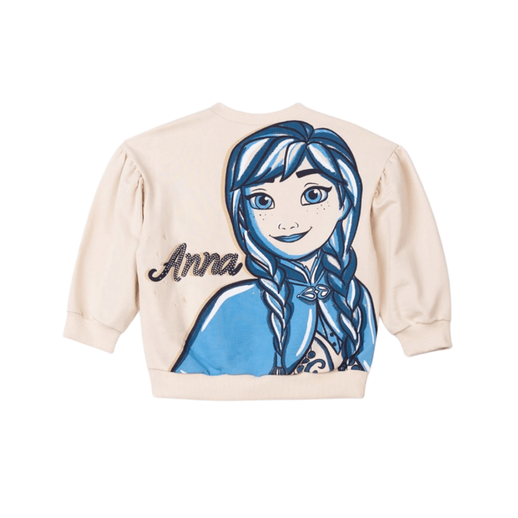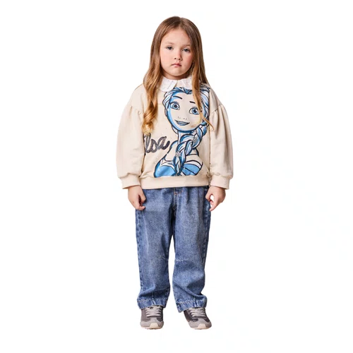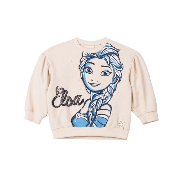 Com estampa exclusiva das personagens Elsa e Ana, o modelo traz aplicação de brilho delicado e acabamento moderno. O tom bege claro é versátil e sofisticado, combinando facilmente com leggings, jeans ou saias para criar looks confortáveis e encantadores.