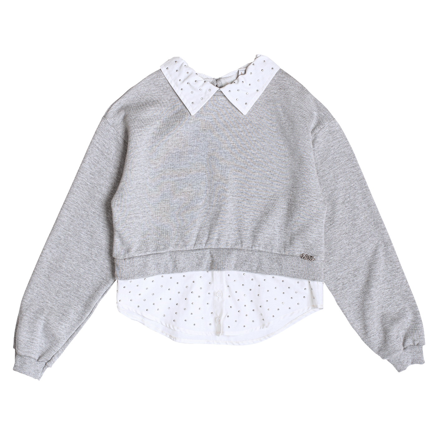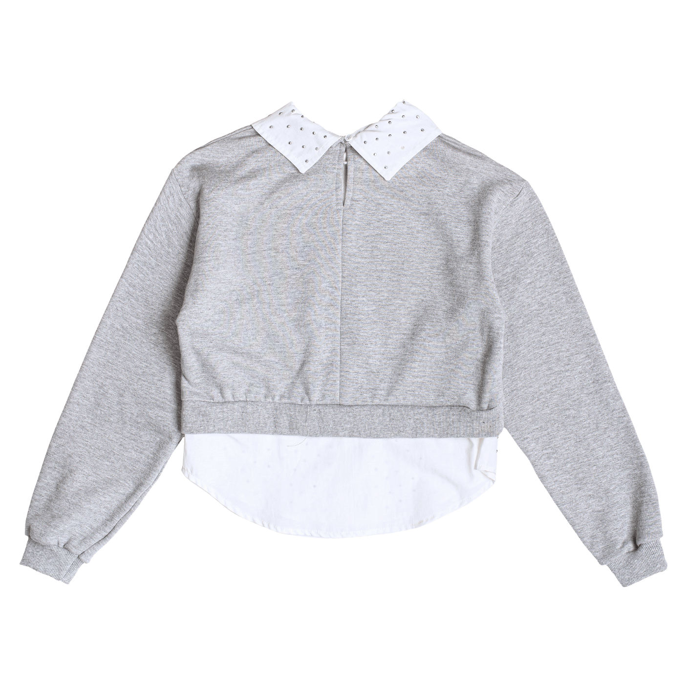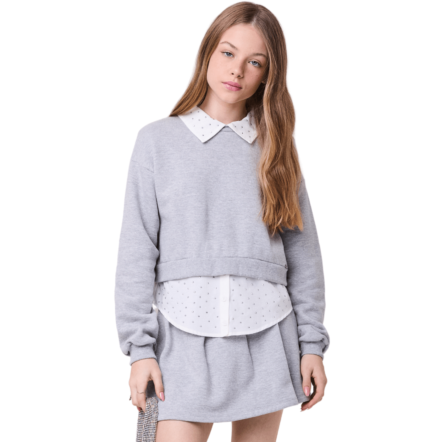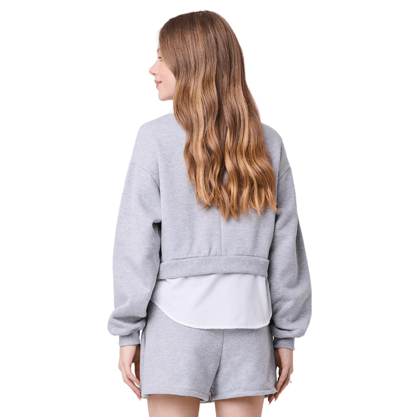 Unindo o estilo urbano ao toque refinado do glam, essa peça única faz o papel de duas em um só look: a parte superior apresenta o moletom com modelagem cropped, barra ajustada e gola redonda, criando uma silhueta moderna e atual. Já a parte inferior imita com perfeição uma camisa branca clássica, adicionando elegância imediata à composição. O charme extra fica por conta dos delicados detalhes em strass, que garantem brilho na medida certa e elevam o visual com sofisticação.