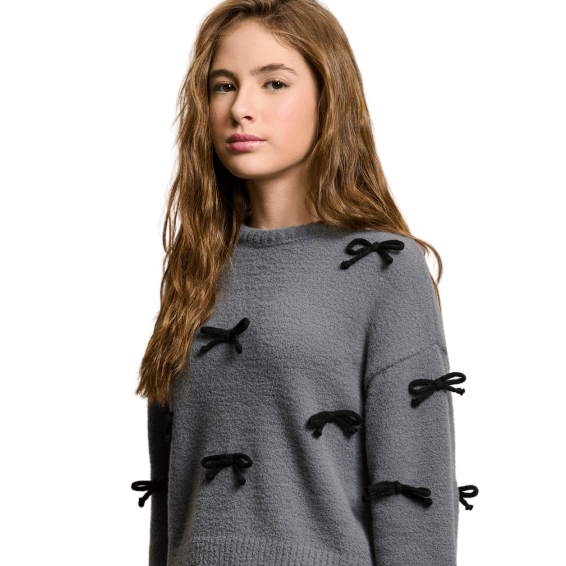 O Blusão Tricot Grafite Lacinhos Authoria é a escolha perfeita para looks modernos, delicados e cheios de estilo para o público teen