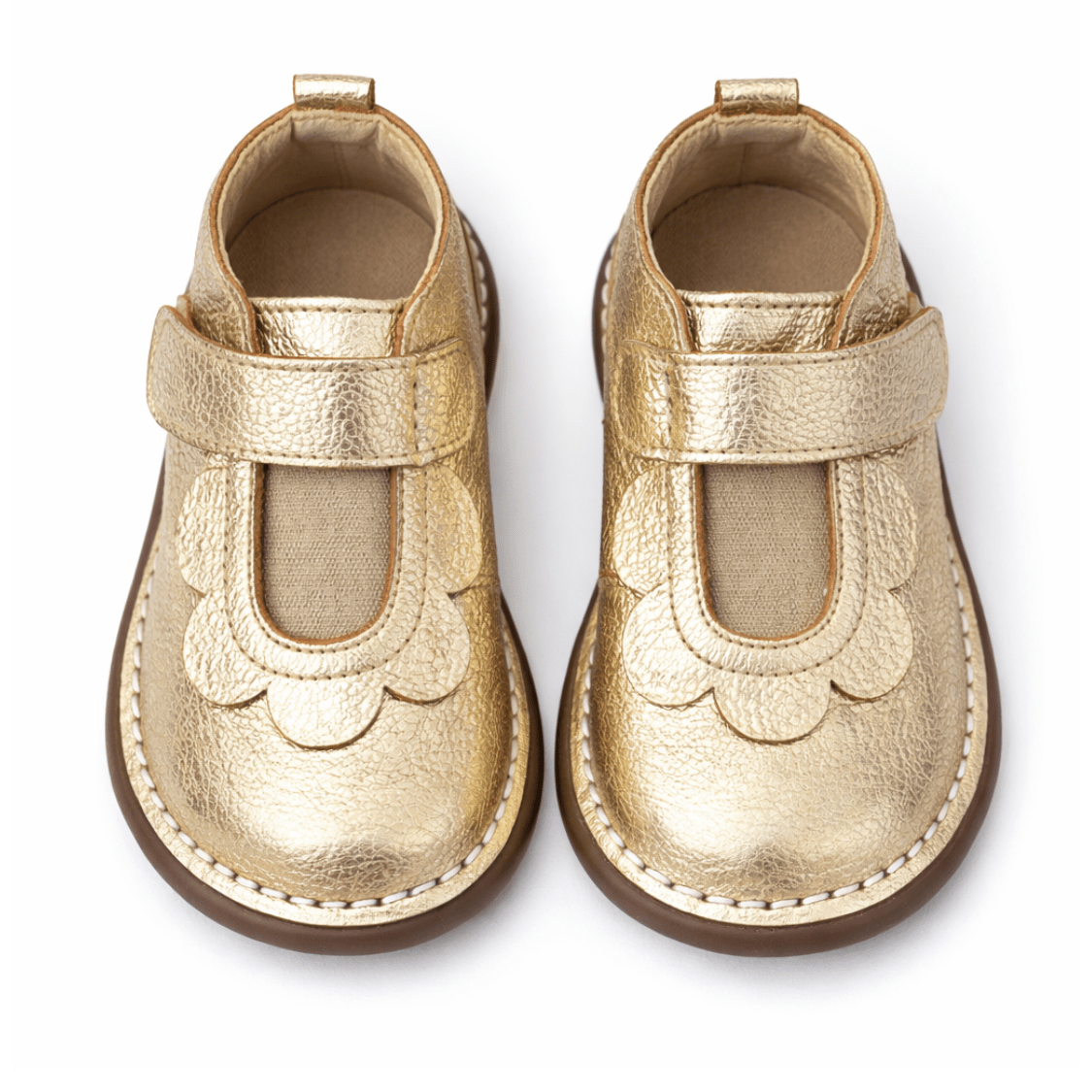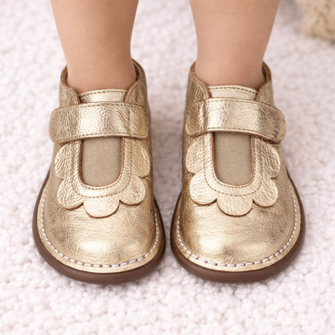 O modelo conta com fechamento em velcro que facilita o calce e proporciona melhor ajuste aos pés. O detalhe frontal com recorte ondulado acrescenta um toque romântico e sofisticado ao design.