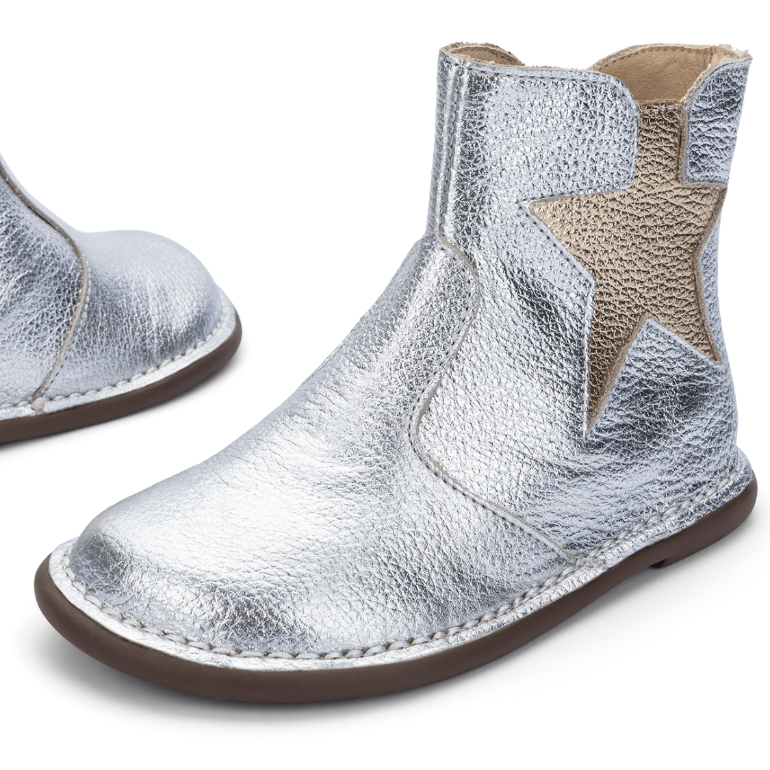 A Bota Galáxia Couro Argent Prata Petit Cheval é perfeita para meninas que adoram looks modernos e cheios de atitude. Confeccionada em couro legítimo metalizado na cor prata, o modelo ganha destaque com a aplicação de estrela lateral, trazendo um visual fashion e divertido.