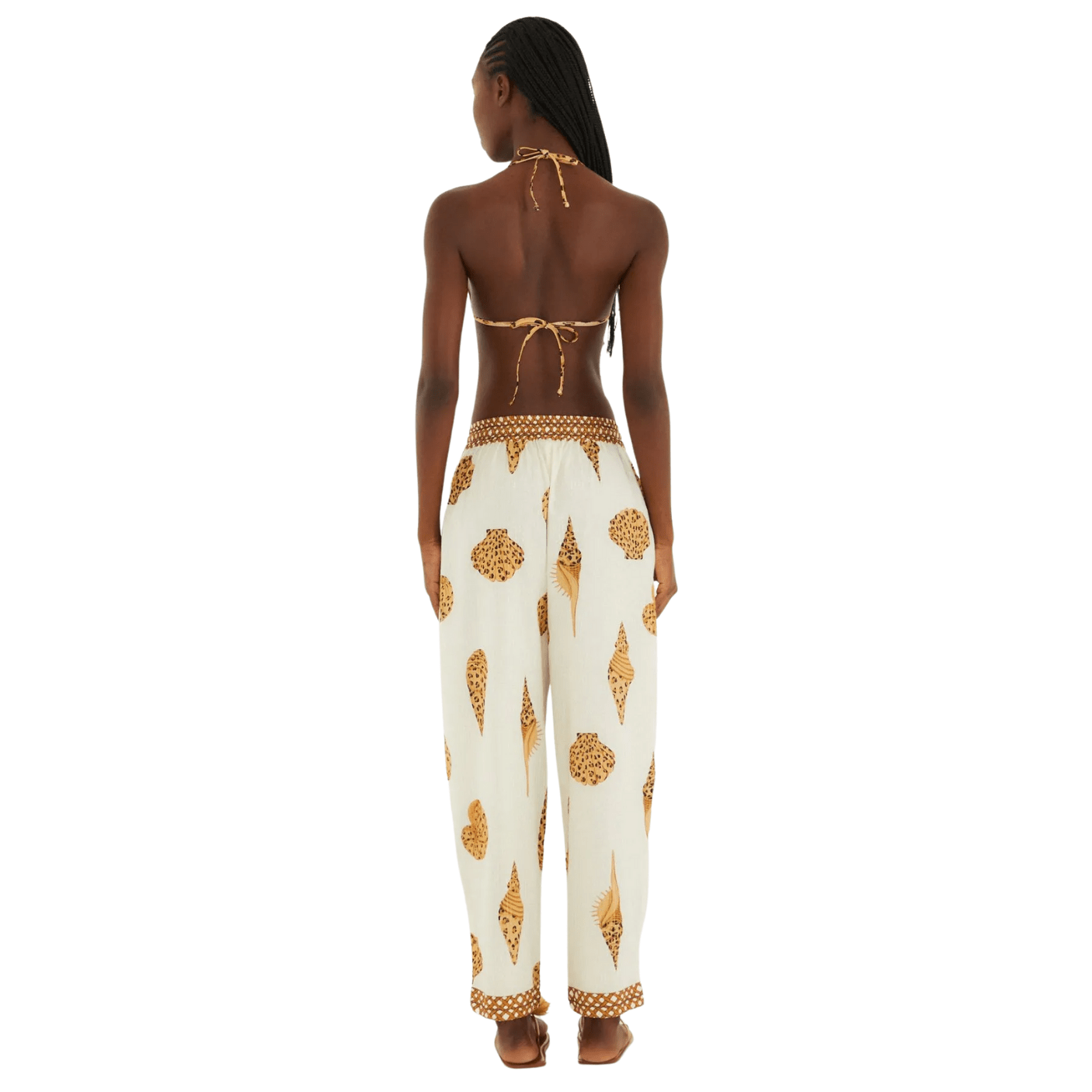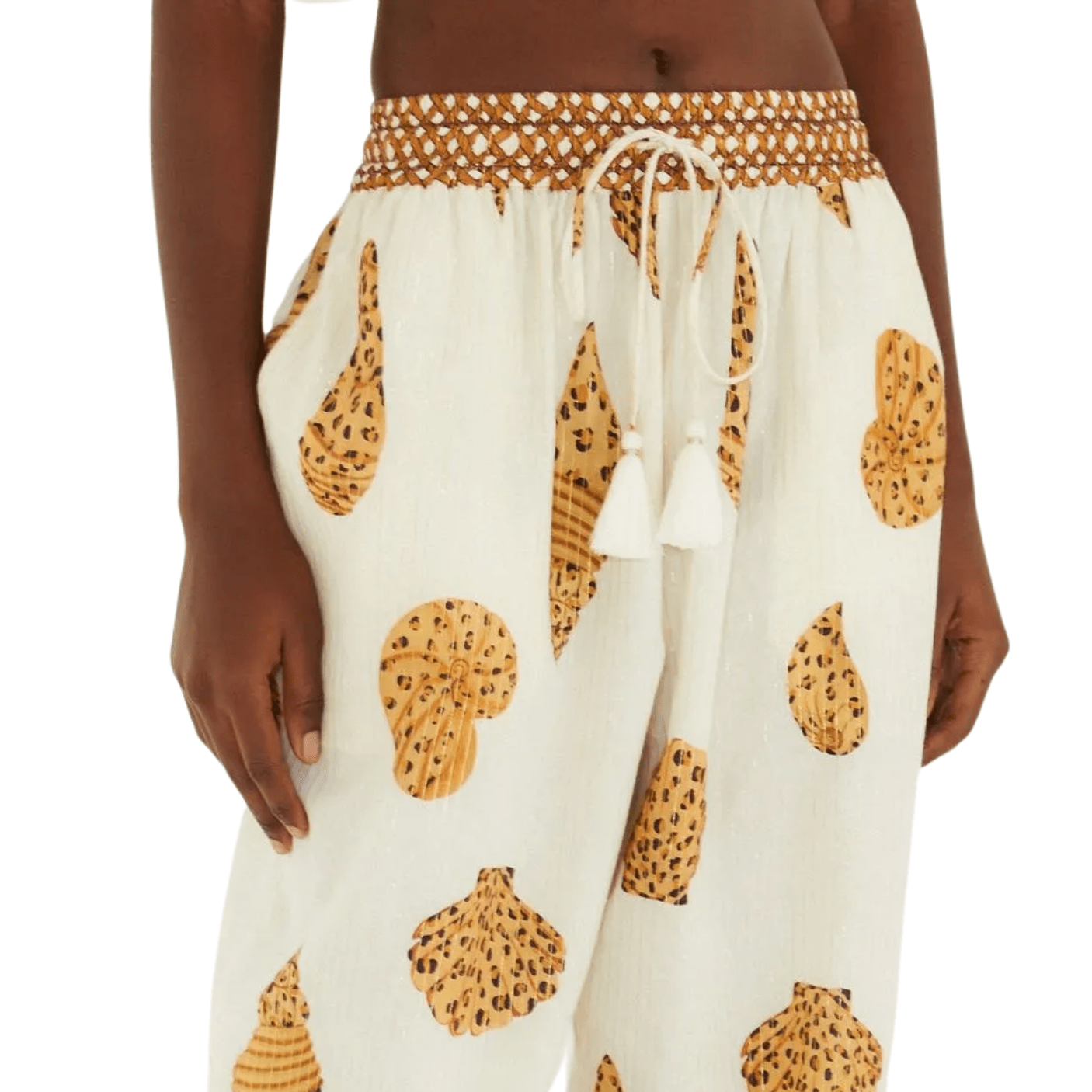 Com modelagem reta e cintura ajustável por cordão, a calça se adapta ao corpo de forma prática e confortável, enquanto os bolsos frontais adicionam funcionalidade ao look. O grande destaque fica por conta da estampa Concha Pintada, que celebra a natureza marinha em tons terrosos e off white, criando uma proposta elegante e ao mesmo tempo descontraída. O acabamento delicado com tassels na barra acrescenta um charme artesanal único, valorizando ainda mais a peça.