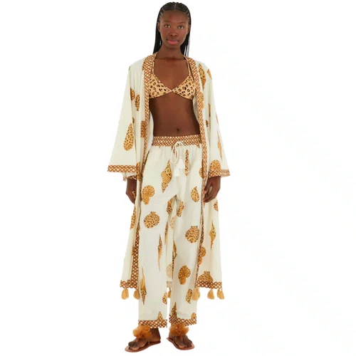 Perfeita para combinar com croppeds, tops ou camisas leves, a Calça Concha Pintada Off também pode ser usada em conjunto com o Kimono da mesma estampa, formando um look coordenado e sofisticado que reflete a identidade criativa e vibrante da Farm Rio.
