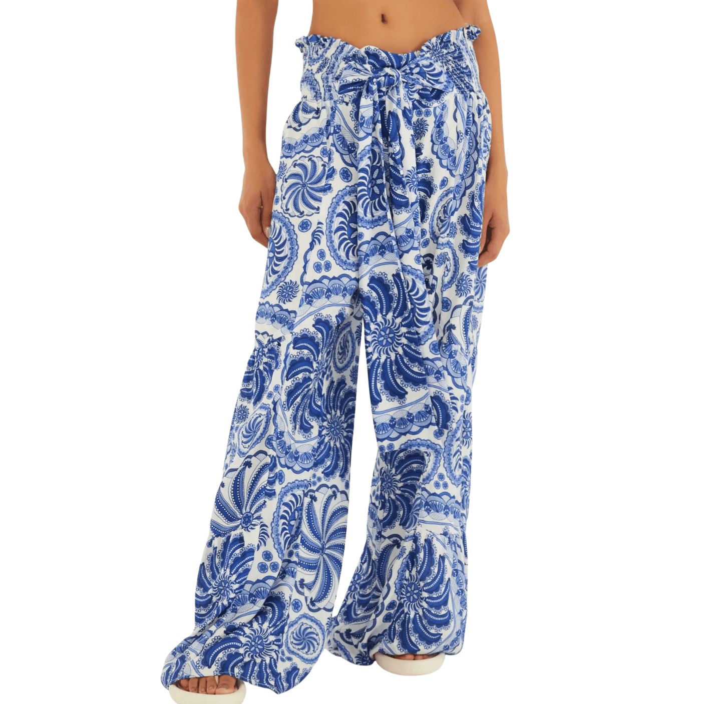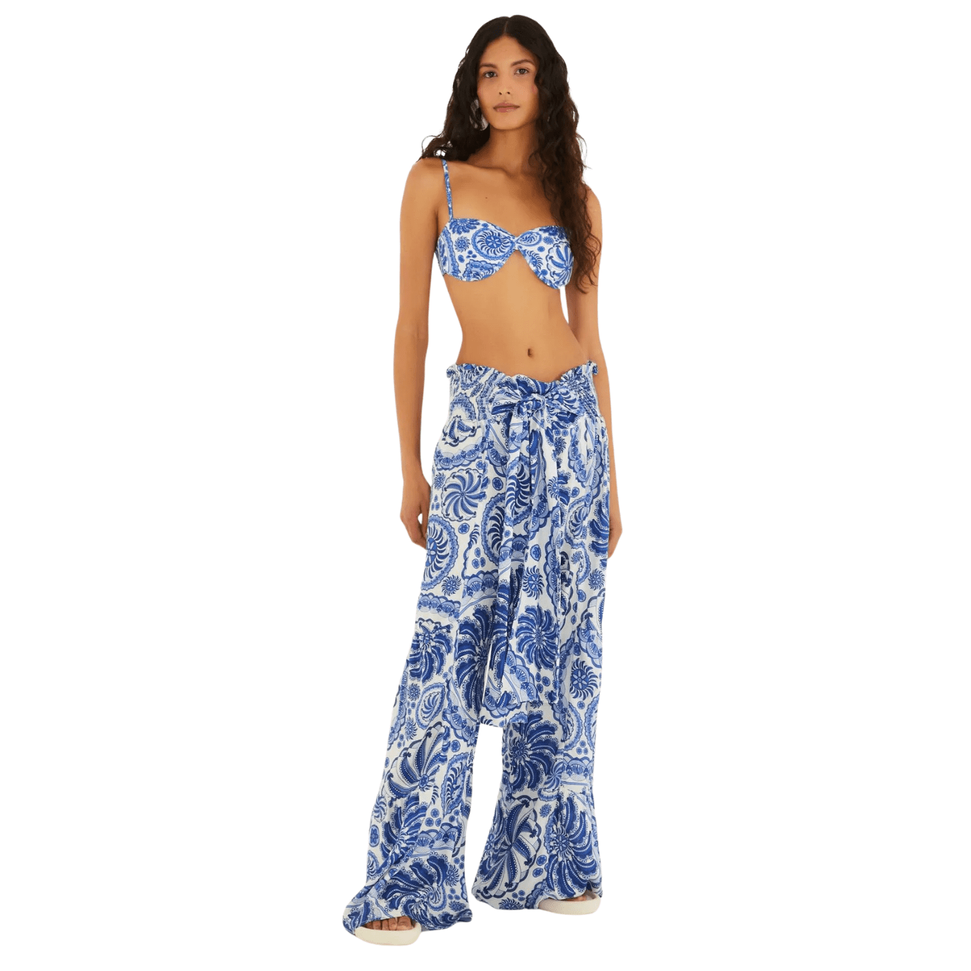 Confeccionada em viscose fluida de caimento leve, a calça traz movimento e frescor ao visual, ideal para os dias de sol e para composições descontraídas de verão. O modelo apresenta cintura alta com elástico e amarração frontal, garantindo ajuste perfeito ao corpo, além de modelagem ampla e soltinha que valoriza a silhueta com charme natural.