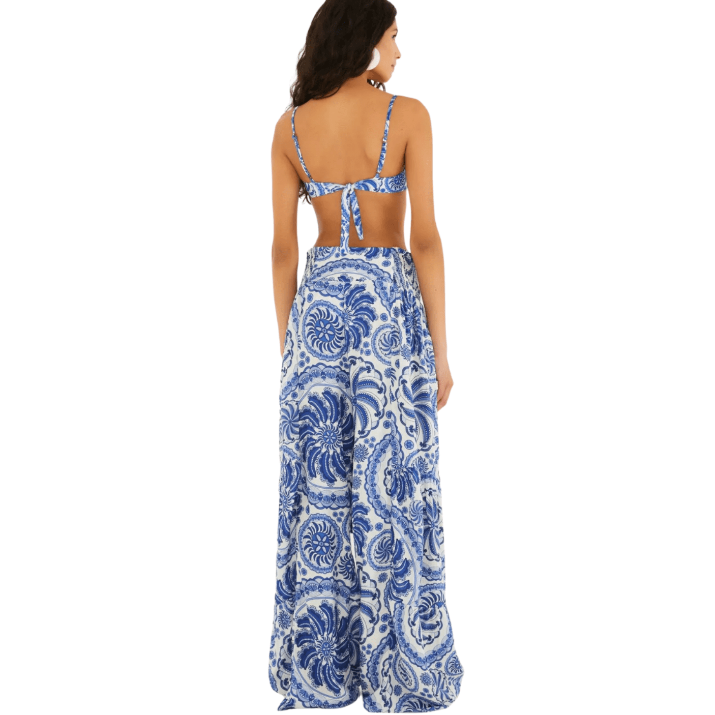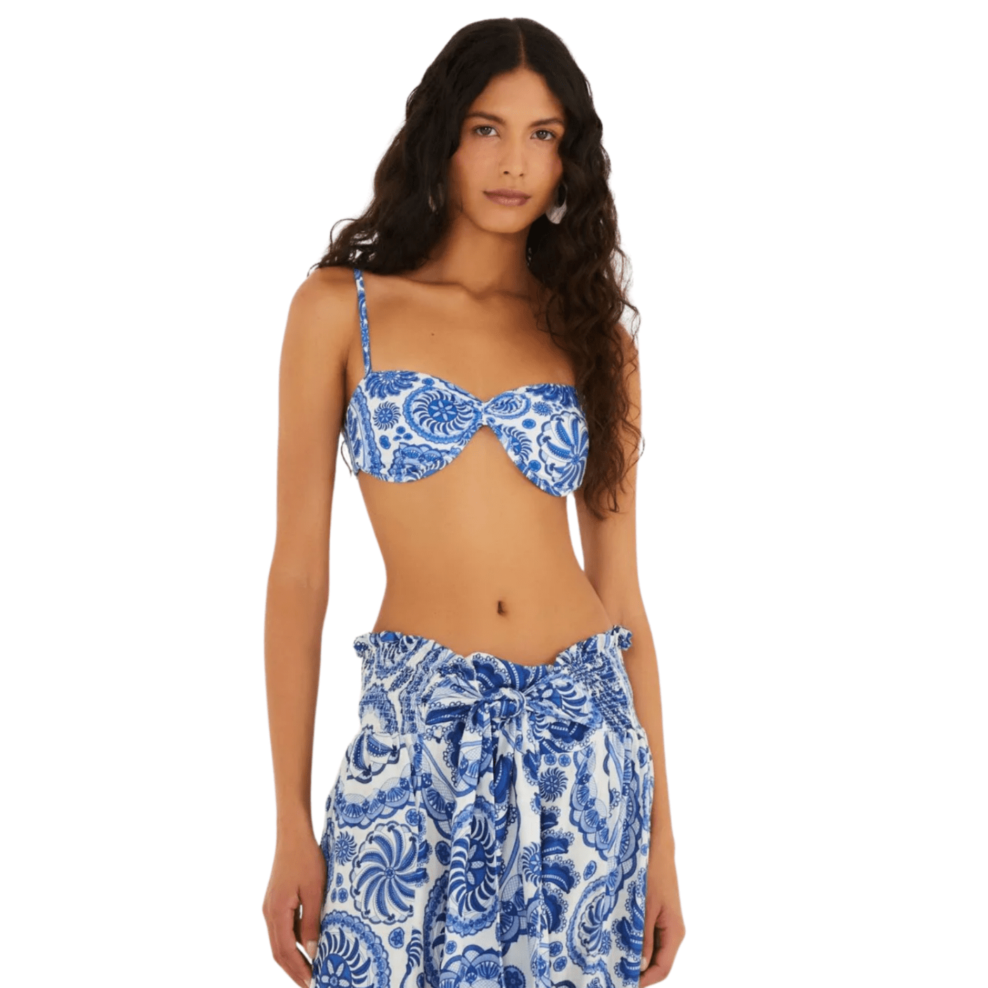 A estampa exclusiva Delicadeza de Banana, em tons de azul e branco, é inspirada na cerâmica artesanal e traduz o estilo tropical-chique da FARM — elegante, atemporal e cheio de personalidade.