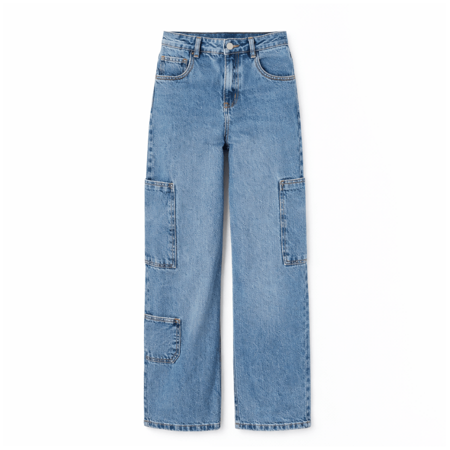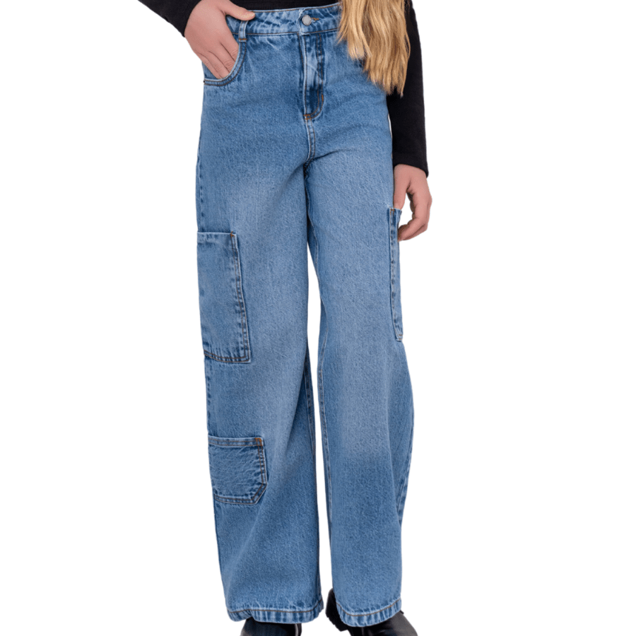 A Calça Jeans Cargo Utilitária Vanilla é a peça perfeita para meninas que amam um visual moderno, despojado e cheio de personalidade