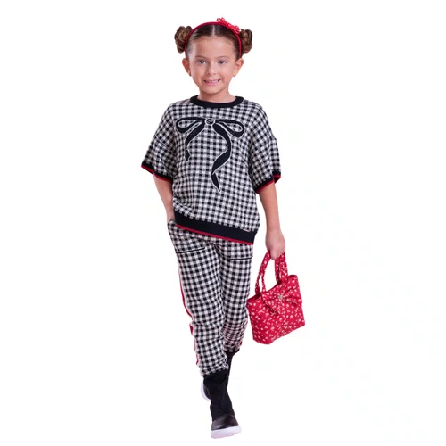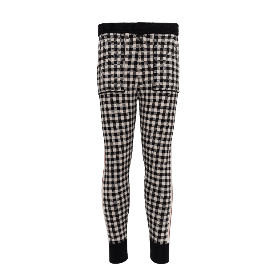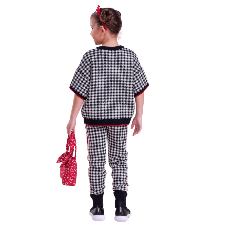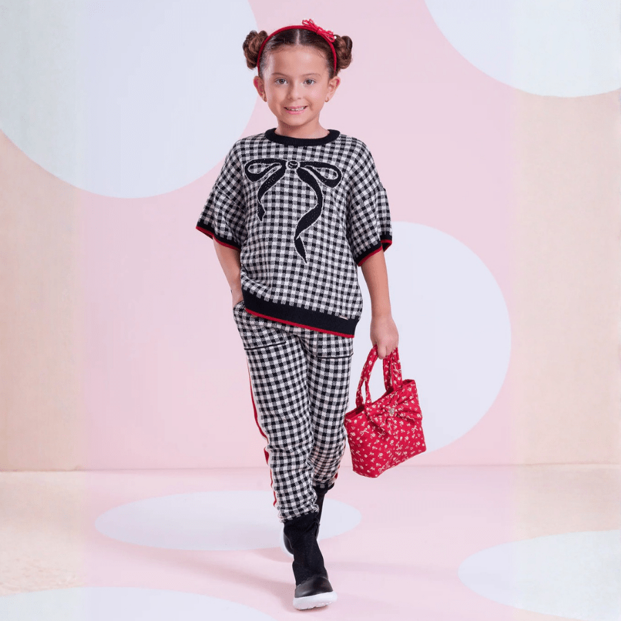 Confeccionada em tricot macio, a calça traz padronagem xadrez clássica em preto e branco, combinada com listras laterais que adicionam um toque fashion e contemporâneo ao visual. A modelagem jogging proporciona ajuste confortável e liberdade de movimento, ideal para acompanhar as pequenas com estilo.
