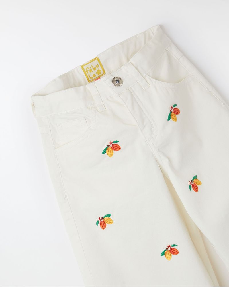 Calça Infantil em Sarja Off White com Bordado Cacaus – Estilo natural e toque artesanal para os pequenos