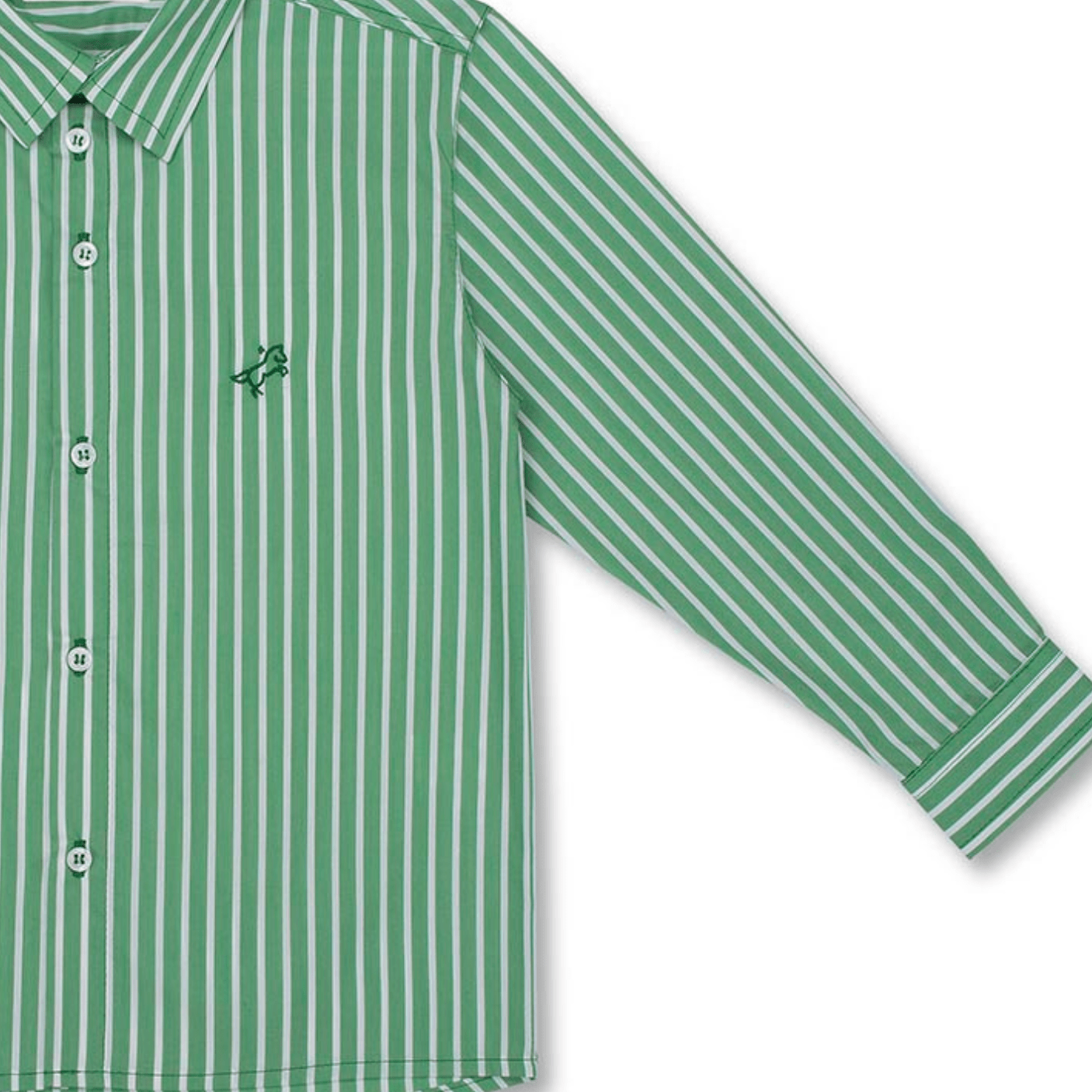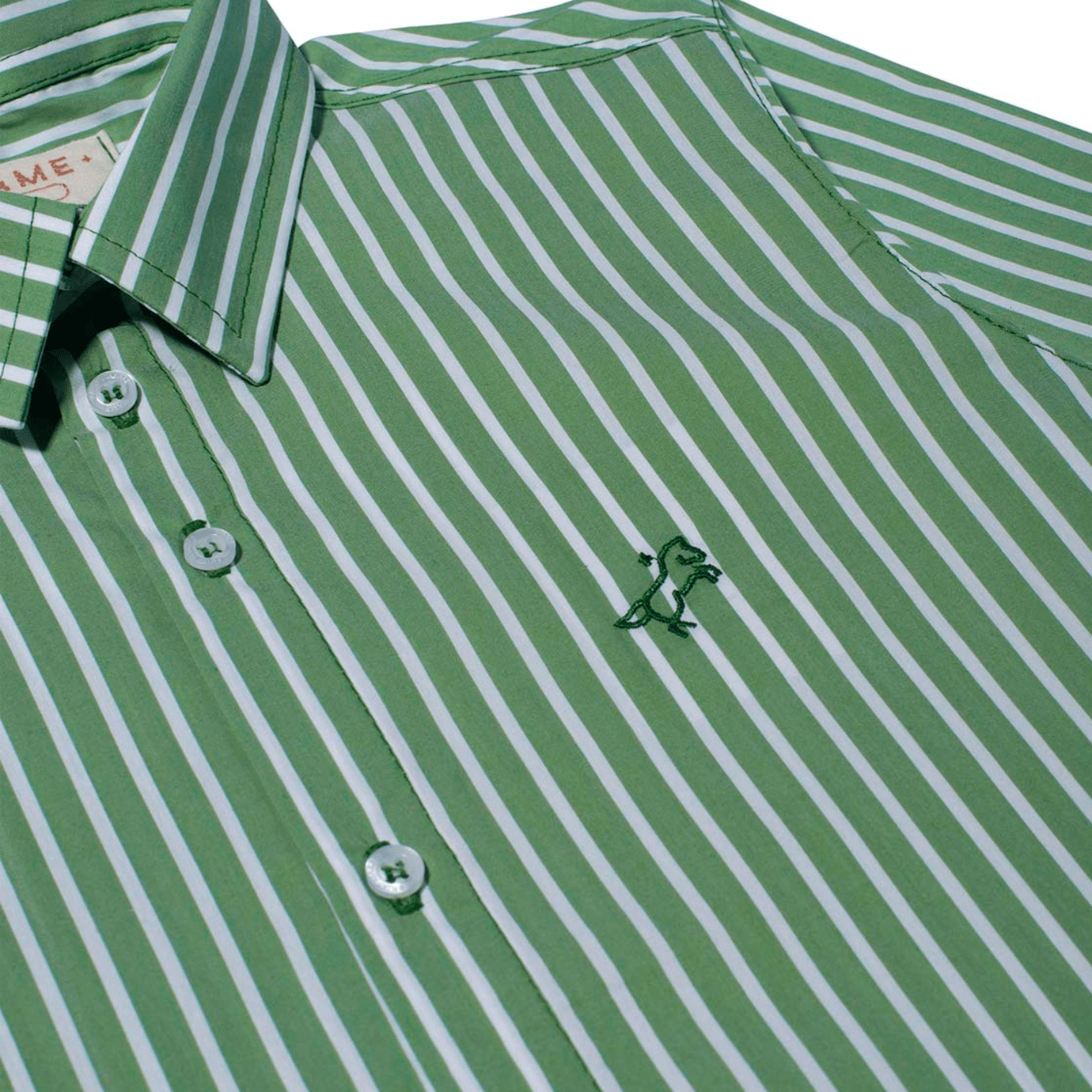 Seu design apresenta listras verticais em tom de verde clássico, um padrão atemporal que nunca sai de moda e combina com diversas propostas de visual. A gola tradicional, as mangas longas com punho abotoado e a modelagem elegante deixam a camisa com um ar social moderno, ideal para aniversários, passeios, jantares em família, sessões de fotos e até eventos escolares.