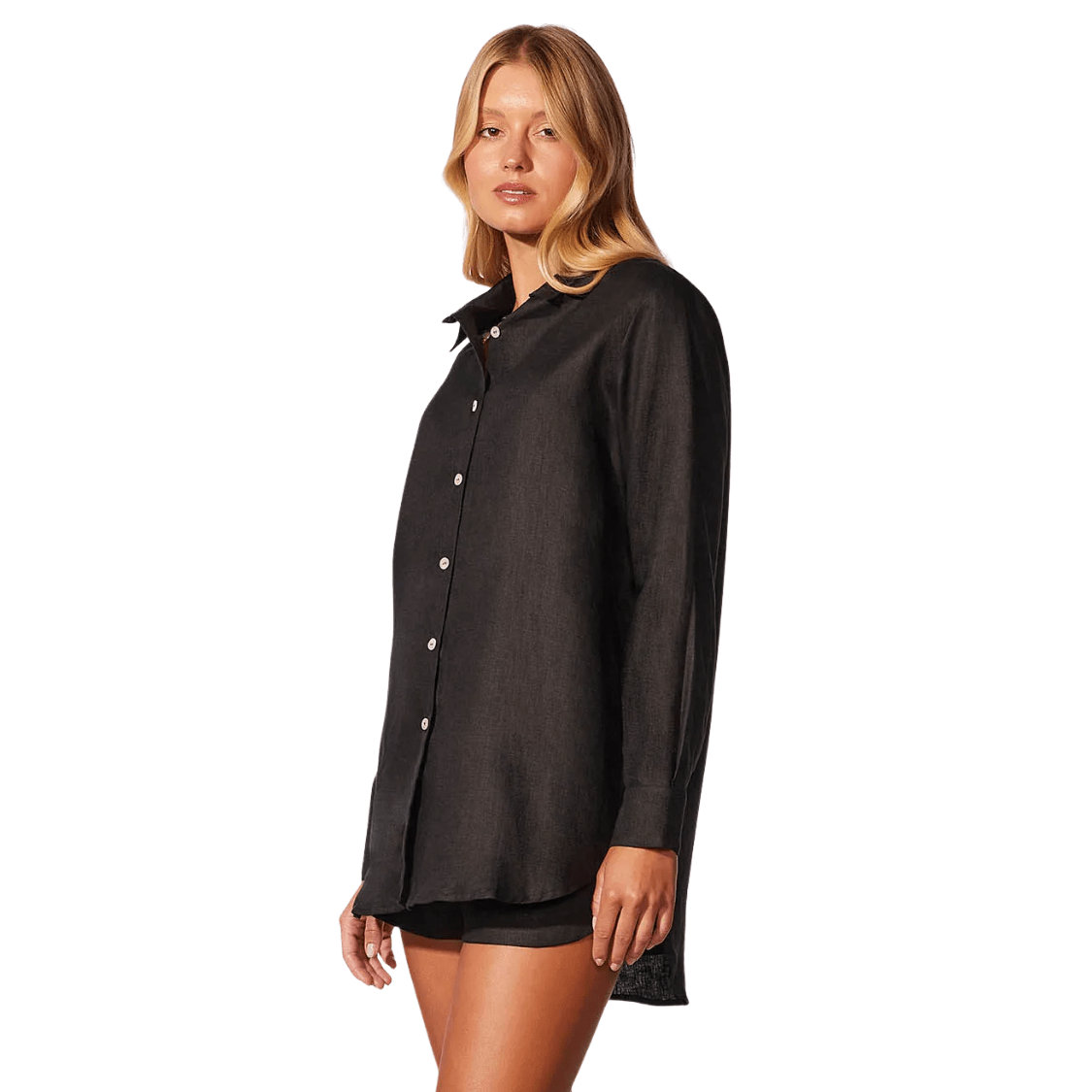 Confeccionada em tecido leve, fluido e confortável, a camisa possui modelagem alongada e soltinha, garantindo um caimento impecável e elegante. O fechamento frontal por botões e a gola clássica trazem um visual refinado, enquanto o comprimento permite diferentes formas de uso — desde saída de praia até sobreposição em looks casuais.