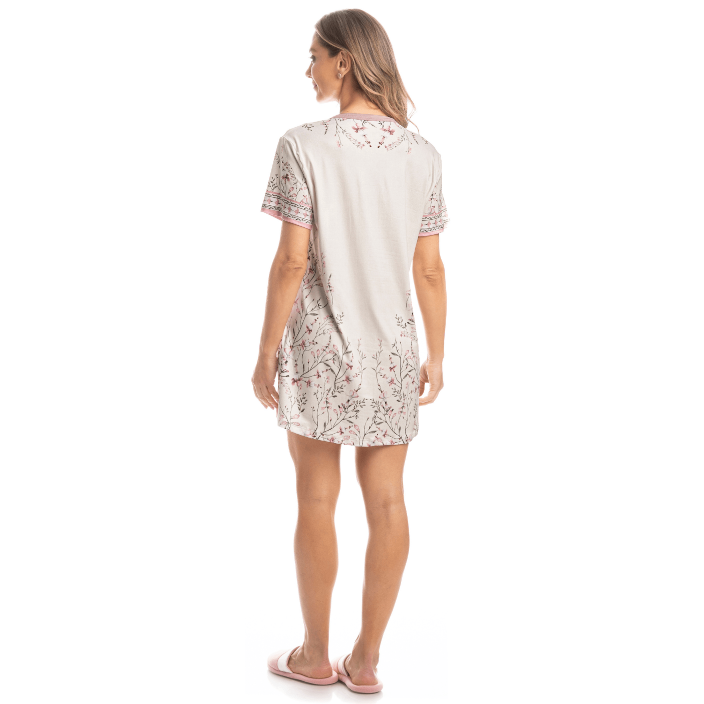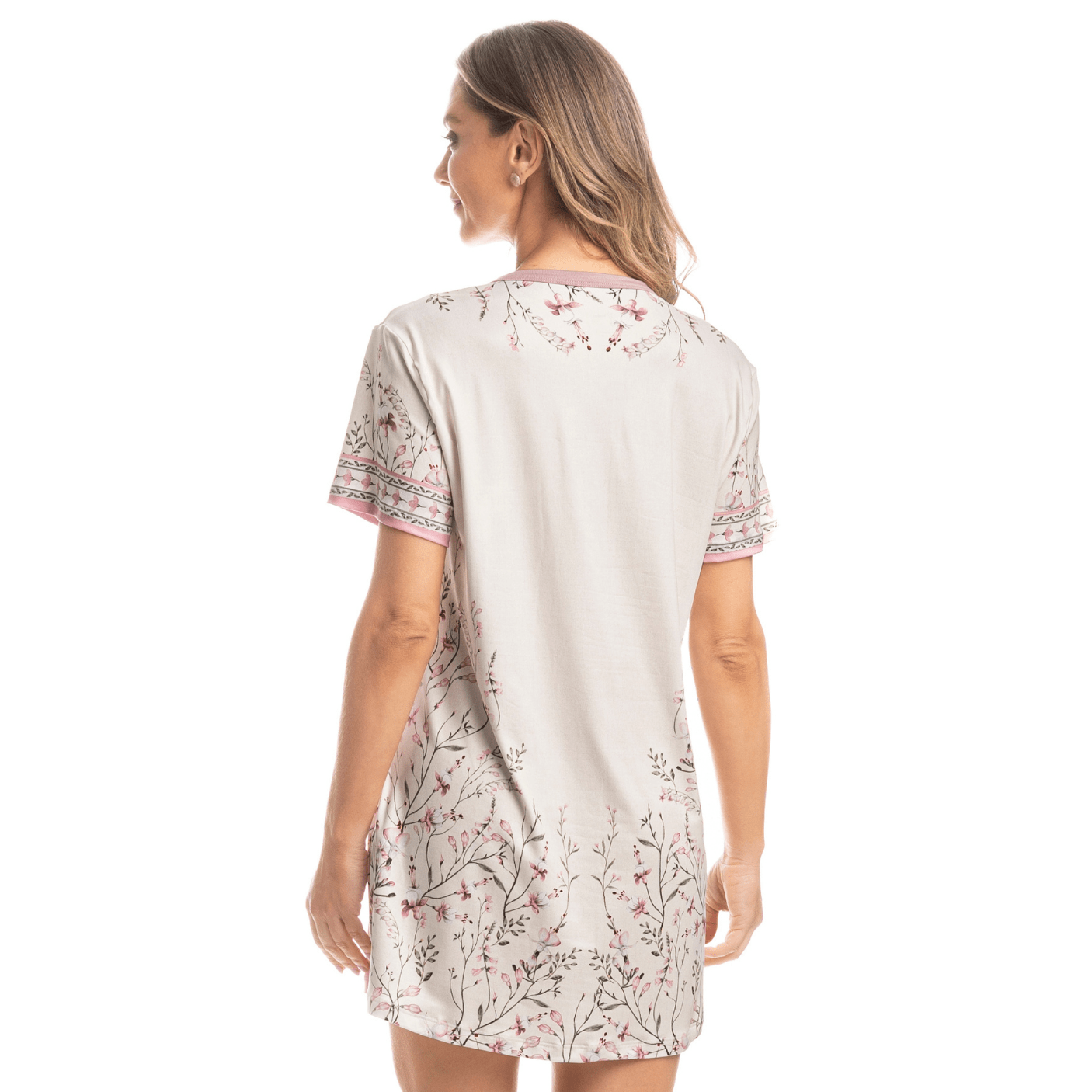 A peça possui mangas curtas e decote redondo com acabamento em viés, conferindo um toque de modernidade e sofisticação. O destaque fica por conta da exclusiva estampa floral "Brinco de Princesa", desenhada à mão, que traz um toque delicado e único ao camisão, tornando-o ainda mais encantador.