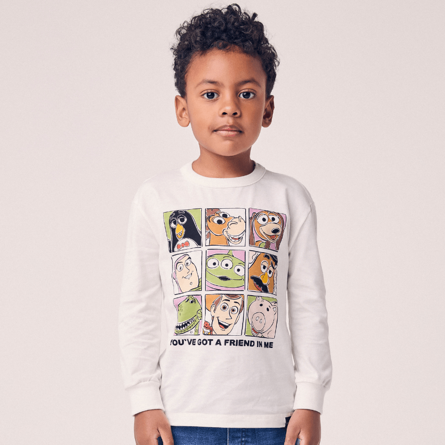 Com fundo off white e composição cheia de personalidade, essa camiseta é perfeita para meninos que amam Toy Story e querem um look confortável e estiloso para o dia a dia.