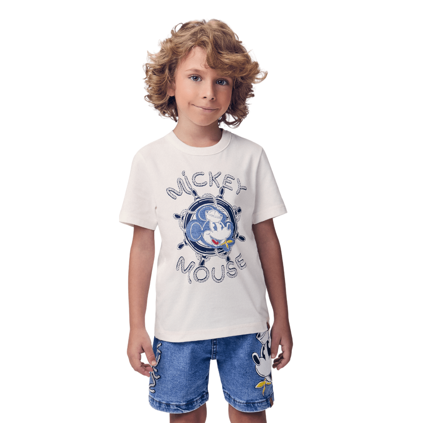 Confeccionada em malha 100% algodão, possui modelagem tradicional e estampa exclusiva do Mickey Mouse em um timão navy estilizado, que traz um ar vintage cheio de personalidade. O tom off white torna a peça fácil de combinar com bermudas jeans, sarja ou moletinho.