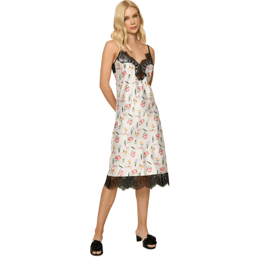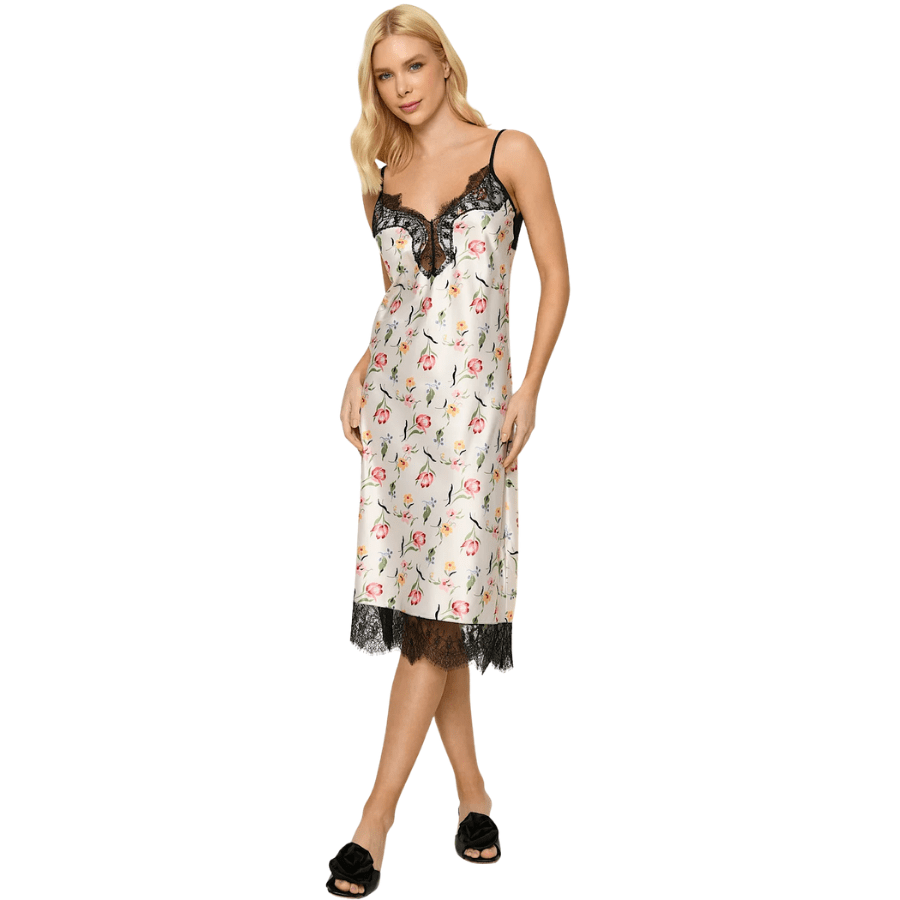 A modelagem midi proporciona caimento leve e confortável, enquanto os detalhes em renda preta no busto e na barra acrescentam um toque sofisticado. As alças finas completam o design delicado, valorizando a silhueta com charme e feminilidade.