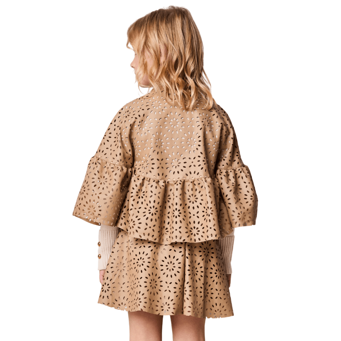 Confeccionado em couro sintético vazado com recortes florais, o casaco apresenta um acabamento refinado que combina charme e leveza. O padrão vazado cria um efeito delicado e elegante, destacando ainda mais o design da peça.