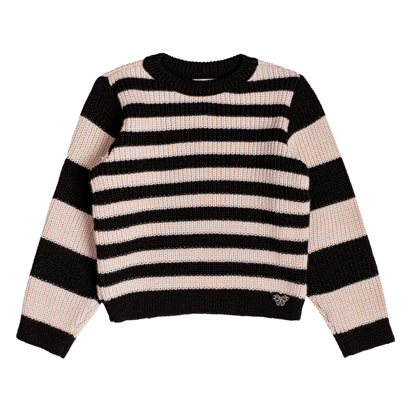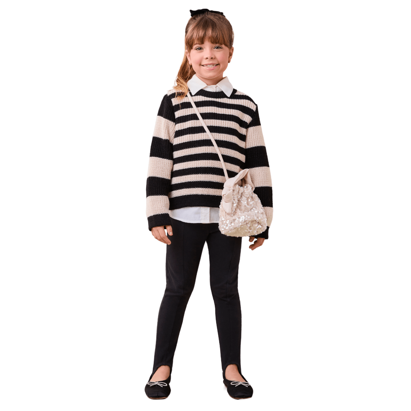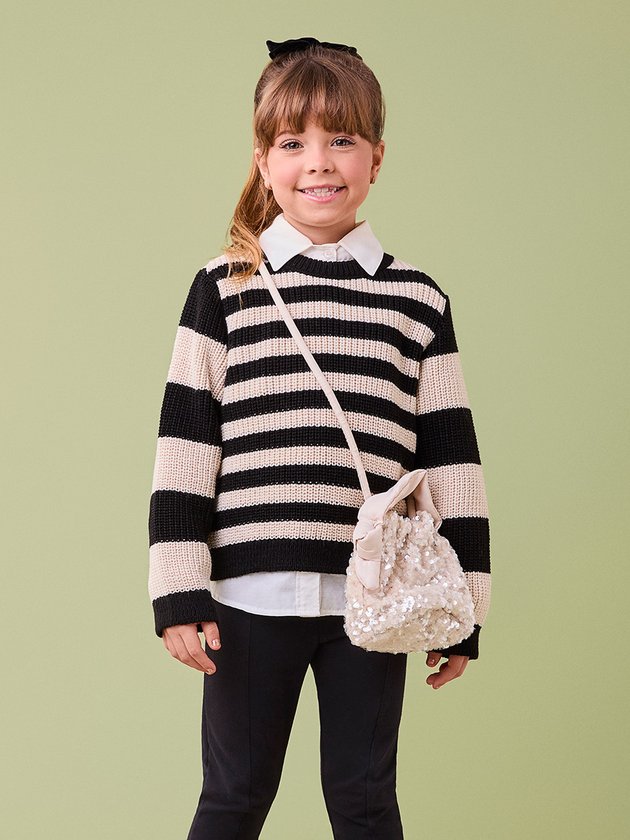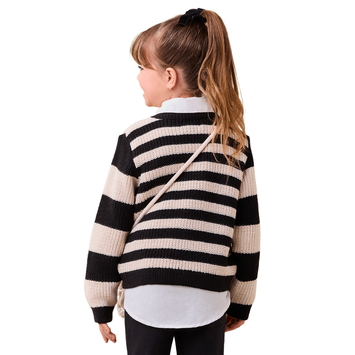 Casaco Infantil Feminino Tricot Listrado Momi – Preto e Bege | Estilo e Conforto para o Inverno