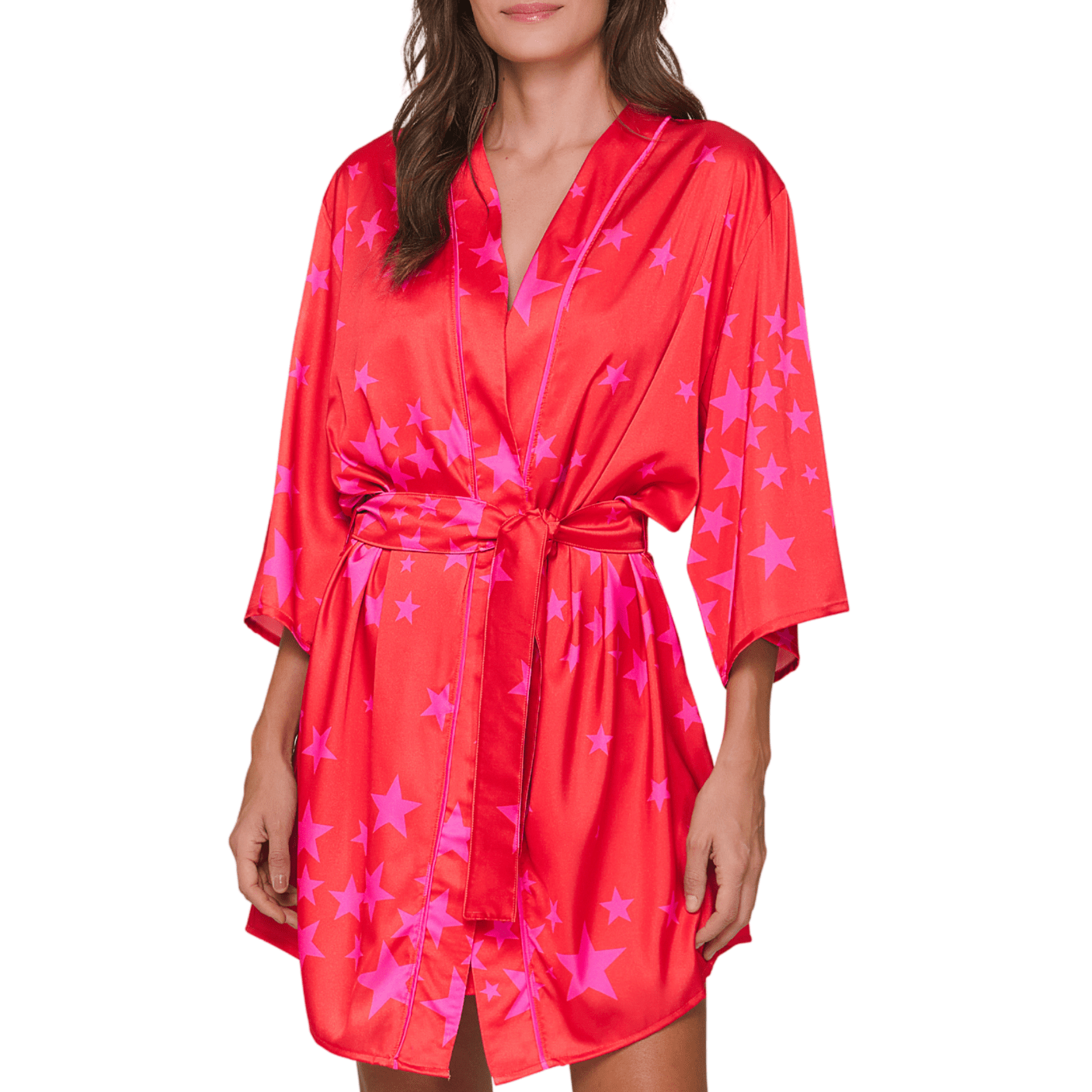 Estilo, conforto e um toque de magia para seus momentos de relax. A Chambre Robe Magic Stars da Lua Lua é perfeita para mulheres que amam peças modernas e cheias de personalidade. Com fundo vermelho vibrante e estampa de estrelas em rosa neon, ela transforma o homewear em um visual marcante e divertido.