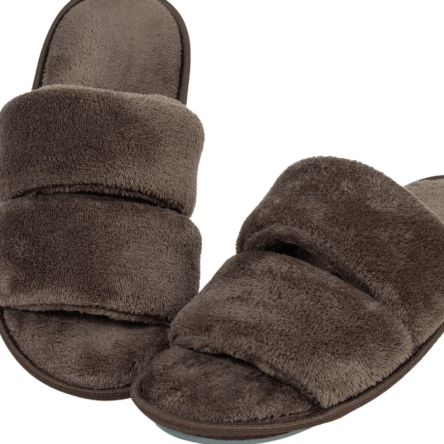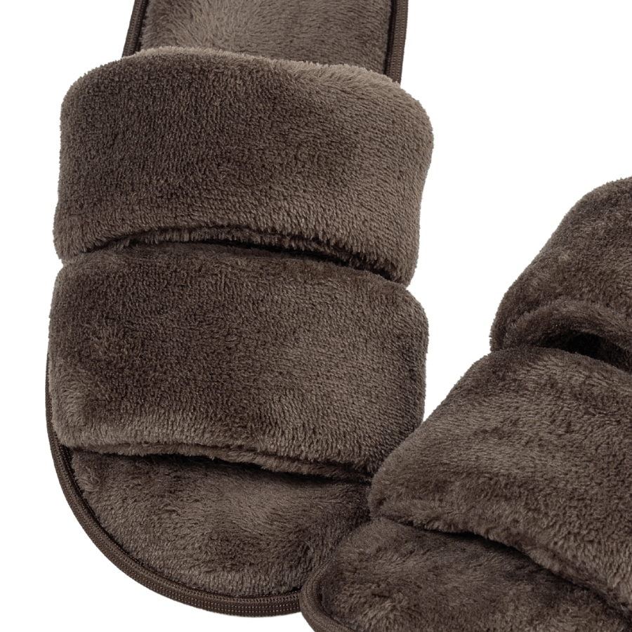 Com acabamento em pelinho macio e design de tira dupla acolchoada, o modelo proporciona aconchego e estabilidade ao caminhar. A cor chocolate traz elegância e versatilidade, combinando perfeitamente com pijamas e looks comfy de inverno.