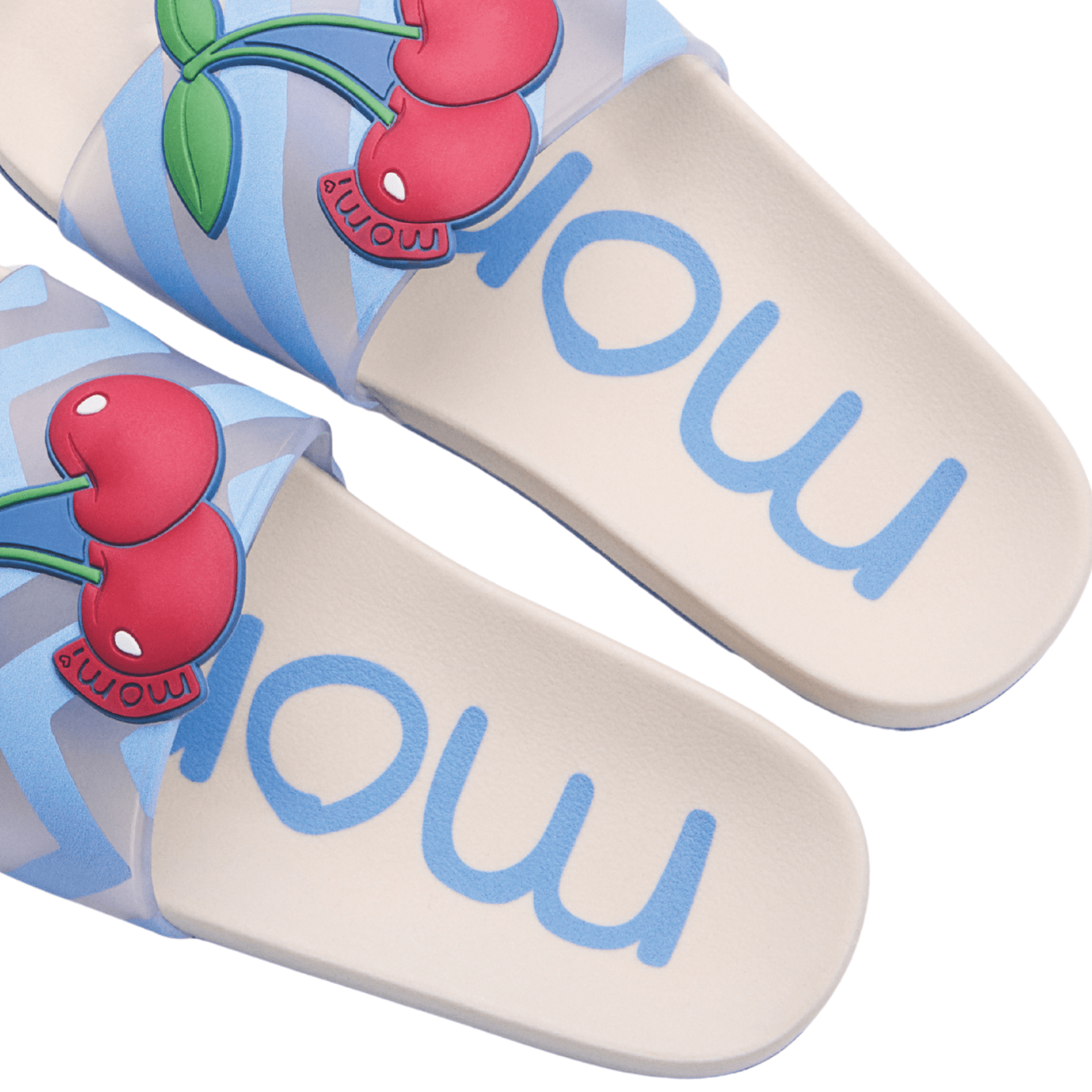 O Chinelo Slider Cerejinha Listra Momi combina estilo, conforto e um toque divertido para os dias mais ensolarados. Com design moderno no estilo slider, ele traz um aplique encantador de cerejinhas em relevo sobre tiras estampadas em listras azuis, garantindo um visual alegre e cheio de personalidade.