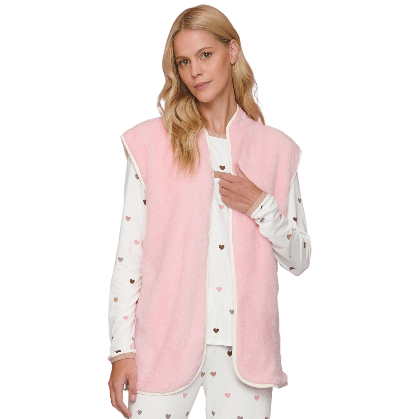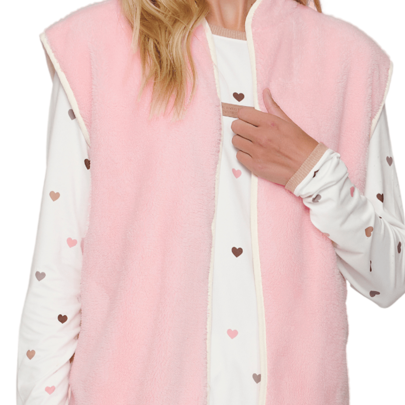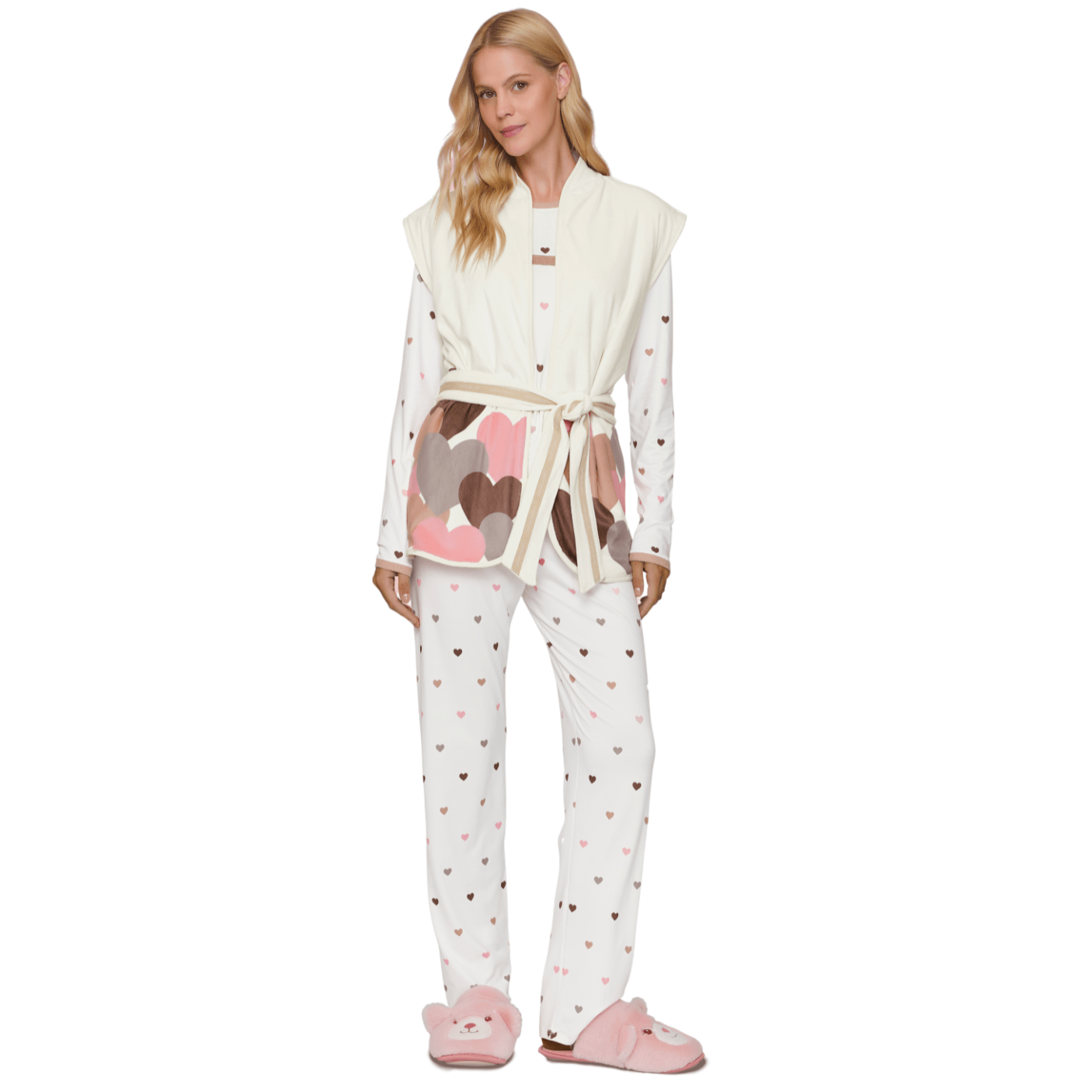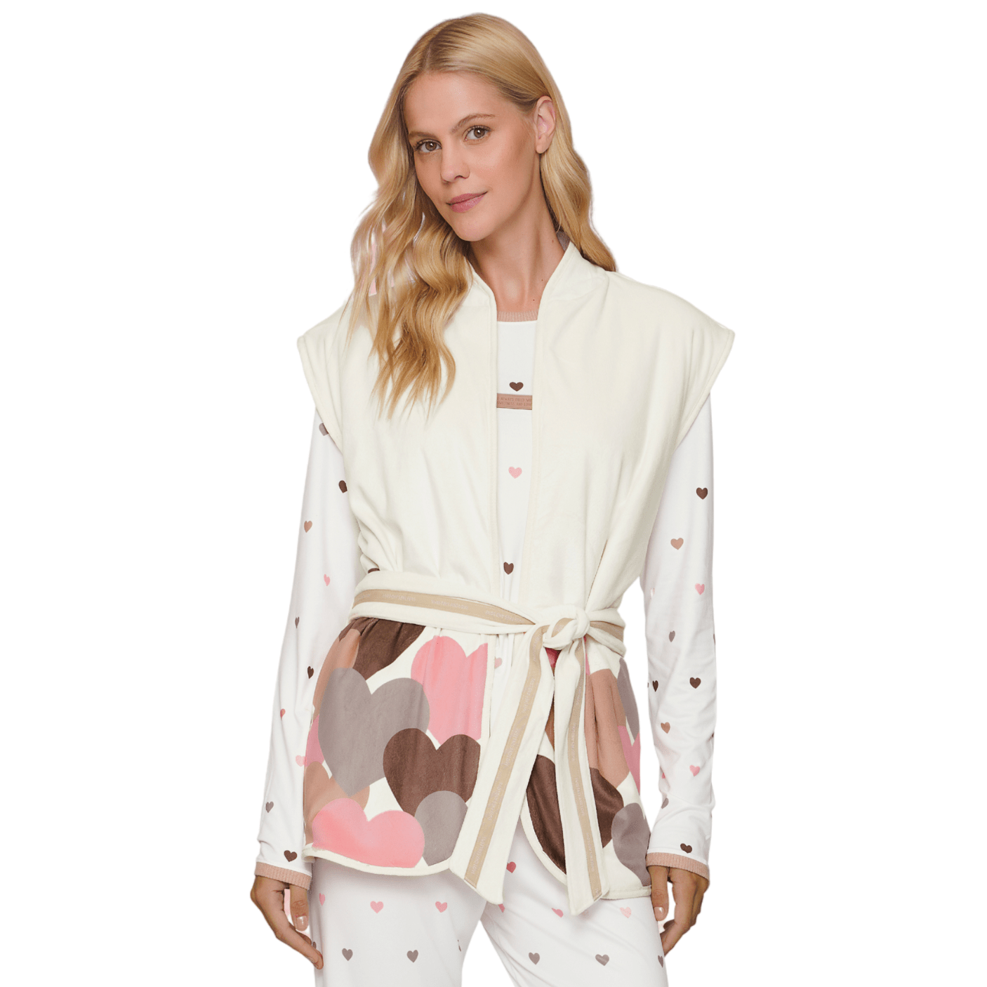 Recheado de amor! Colete dupla face, confeccionado em Velvet Lux estampado em arte localizada barrada de um lado e Premium Flock do outro. A peça conta com uma faixa ajustável na cintura, proporcionando versatilidade e estilo, perfeita para sobrepor os pijamas deste coordenado criando uma composição delicada e quantinha para curtir o frio em grande estilo!
