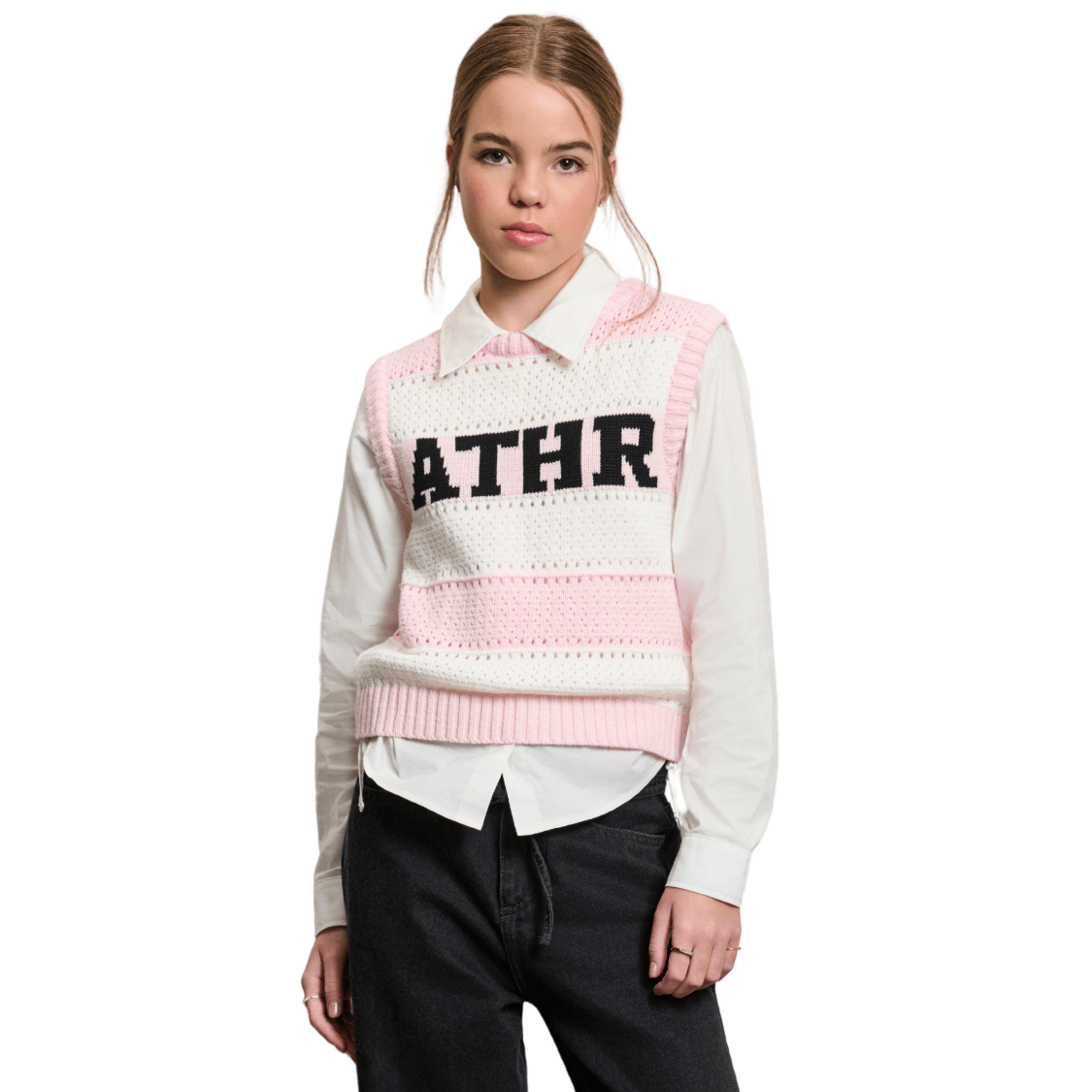 O Colete Tricot Off e Rosa ATHR Authoria é a peça perfeita para compor looks modernos, estilosos e cheios de personalidade para o público teen