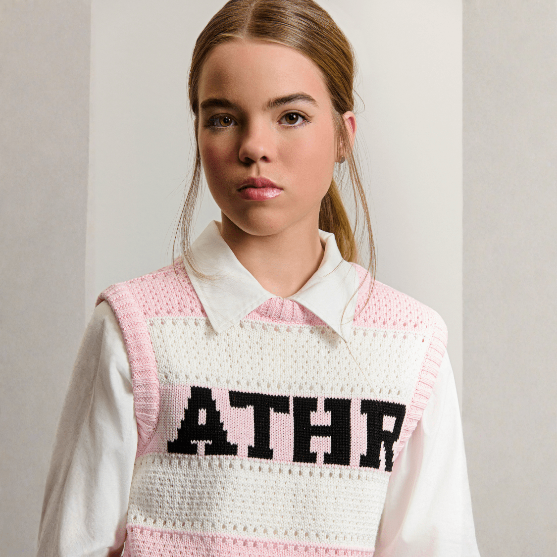 Com uma proposta preppy fashion, o modelo combina tons delicados de off white e rosa, trazendo um visual atual e sofisticado. O destaque fica por conta do lettering ATHR, que adiciona um toque urbano e moderno à peça.