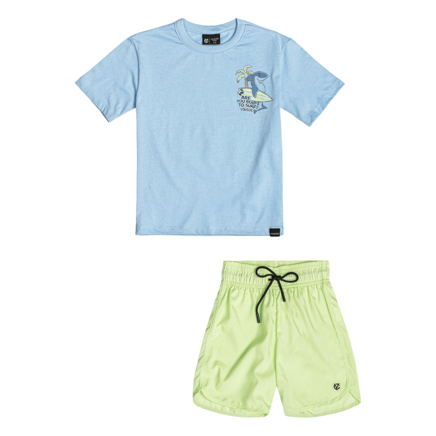 O Conjunto Azul Delavê Surf Tuba Youccie é perfeito para os meninos que amam o clima do verão e as aventuras do mar.