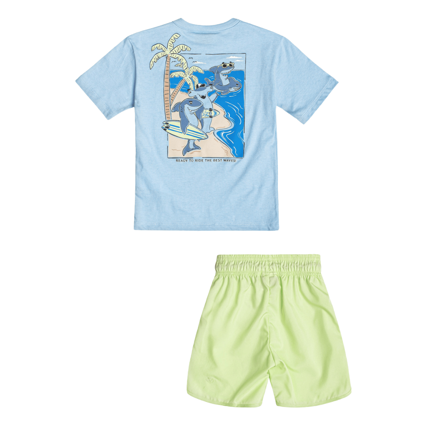 A camiseta em malha azul delavê traz uma estampa divertida de tubarão surfista, com toque suave e caimento soltinho. O shorts verde neon, em tecido leve e confortável, possui elástico na cintura e bolsos funcionais, garantindo praticidade e liberdade de movimento.