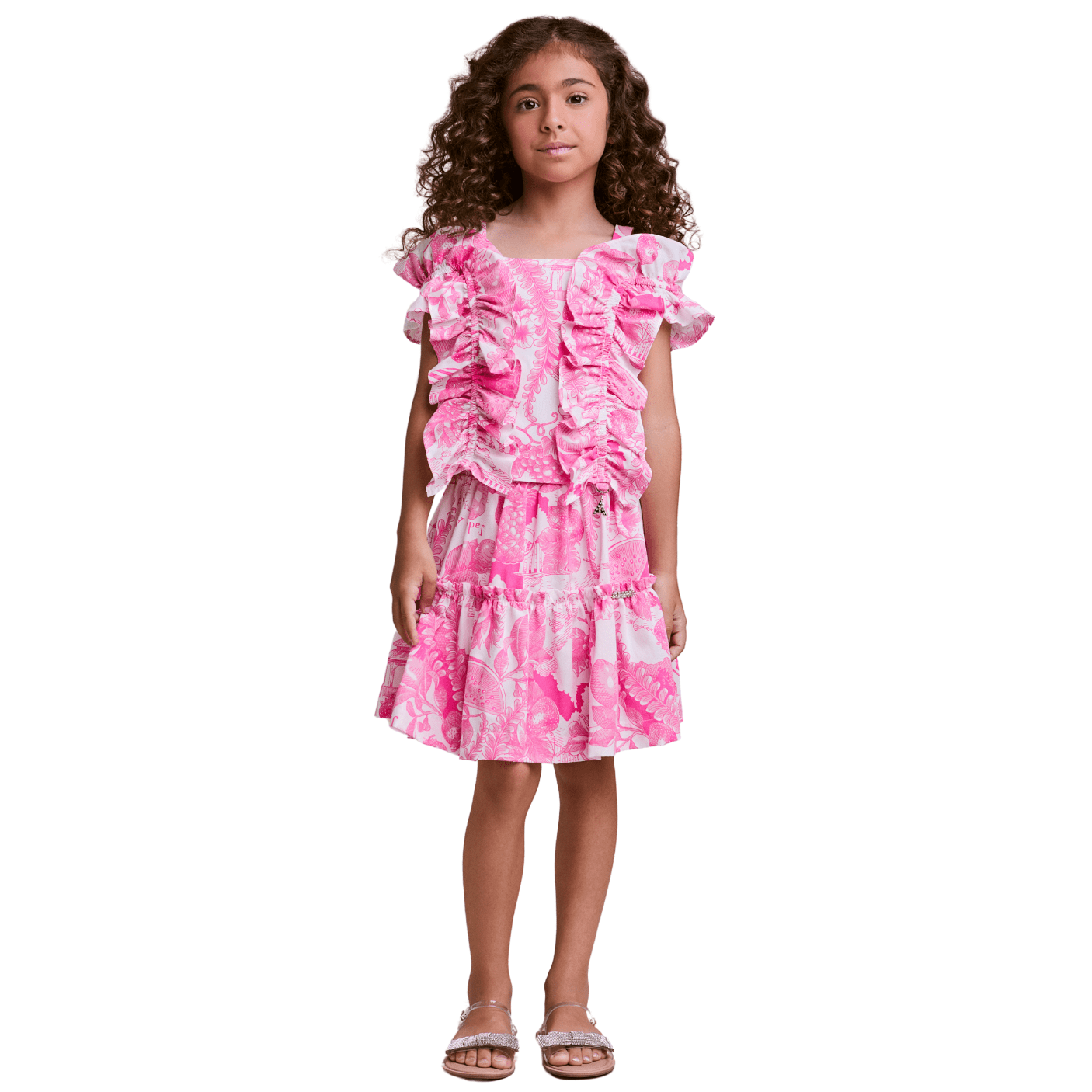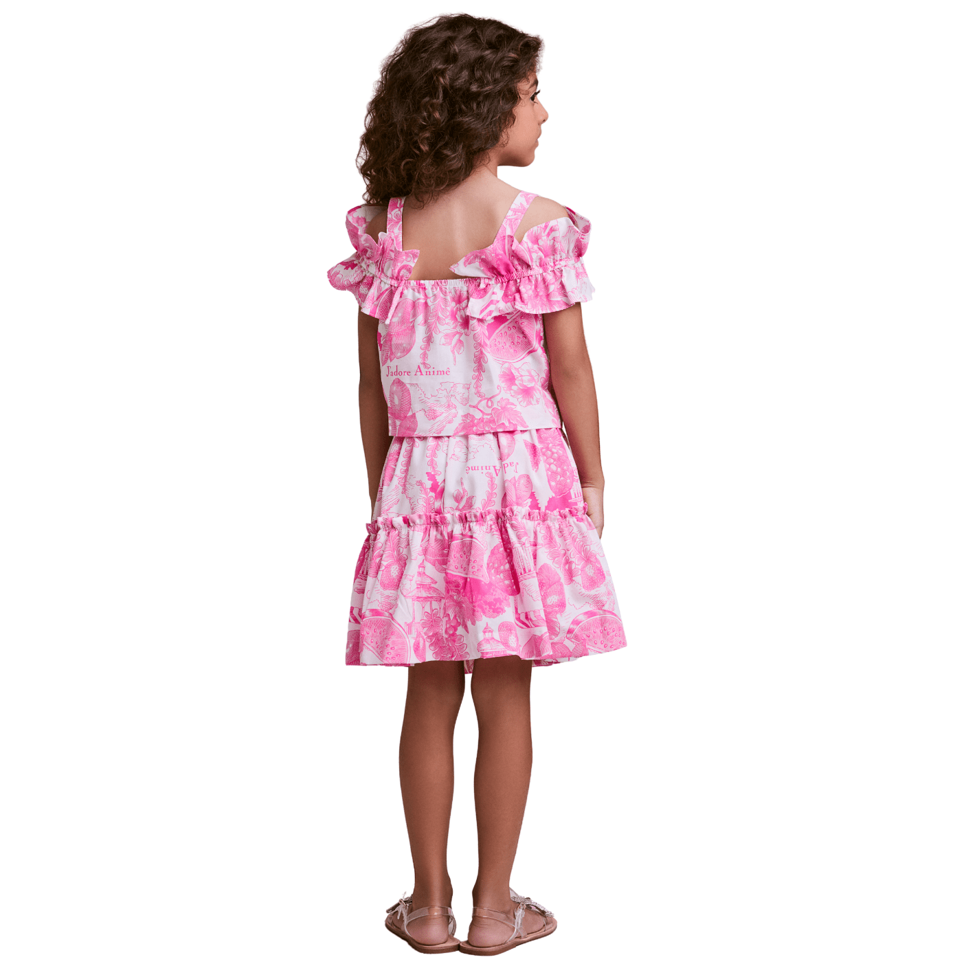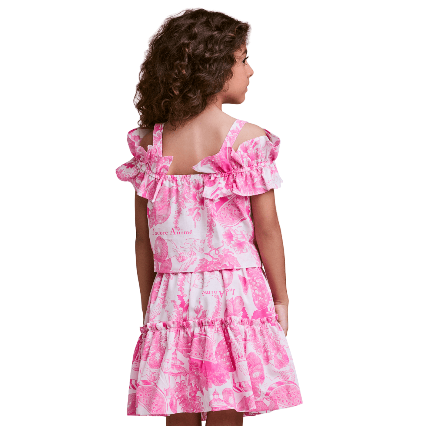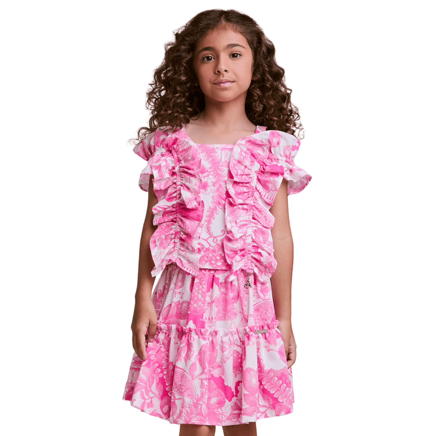 A blusa possui babados frontais marcantes, que criam um efeito volumoso e elegante, enquanto as mangas com babadinhos complementam o visual romântico. A estampa exclusiva de frutas em tons de rosa pink traz um toque divertido e sofisticado ao mesmo tempo. A saia com recortes e pregas garante movimento e conforto, perfeita para dias de passeio ou ocasiões especiais.