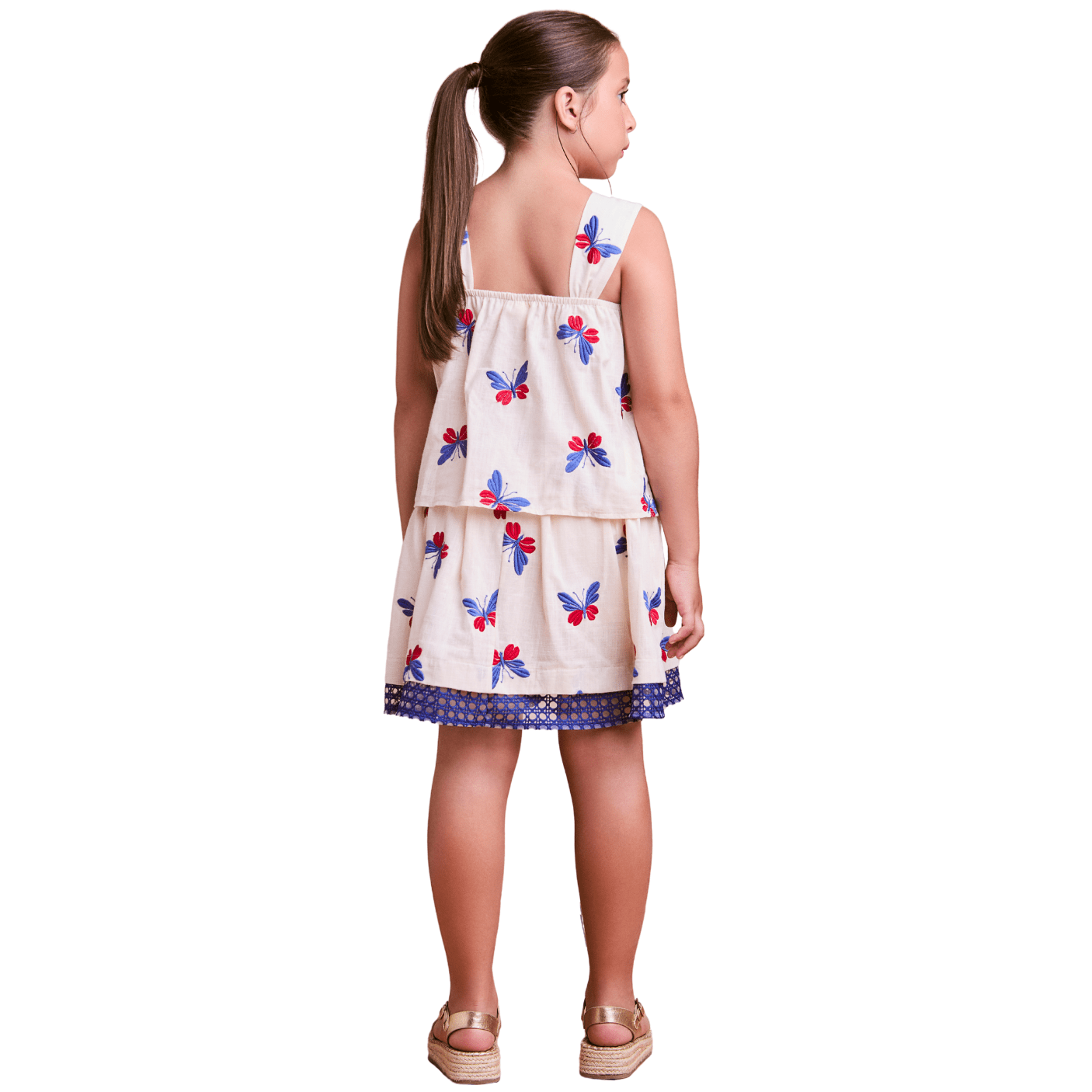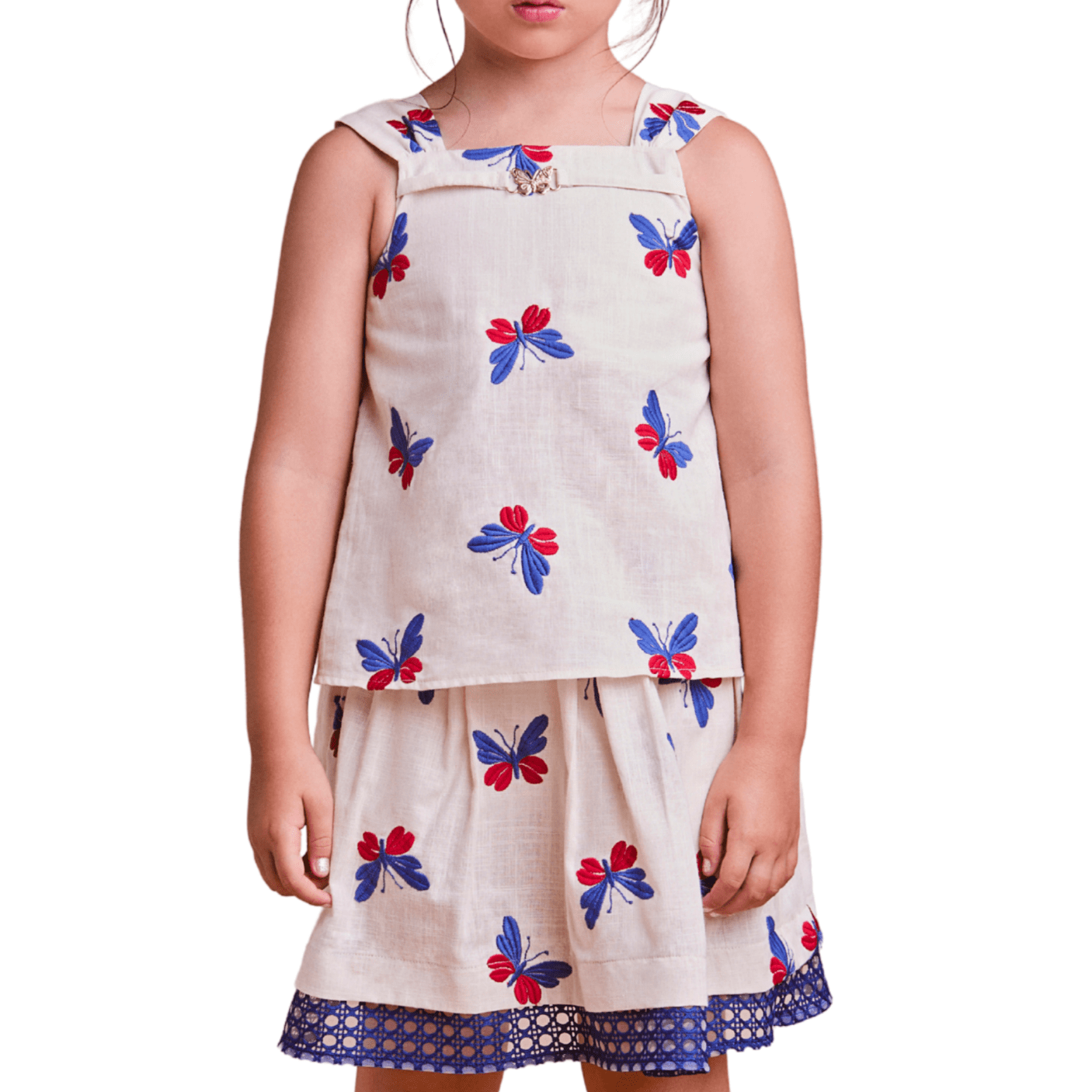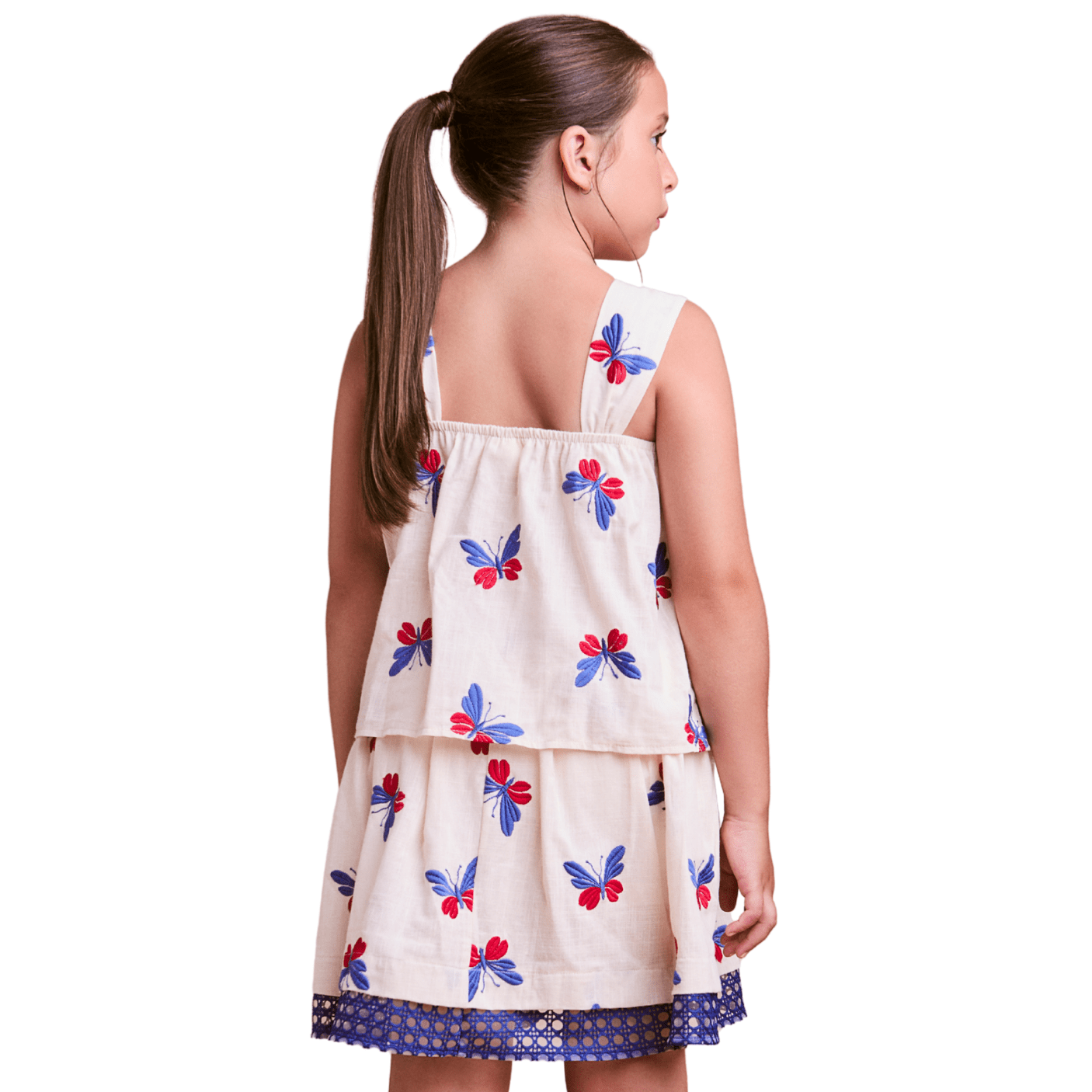 Blusa sem mangas, com caimento reto e confortável, confeccionada em tecido leve. O destaque da peça fica por conta dos encantadores bordados de borboletas nas cores azul e vermelho, que trazem vida e feminilidade à peça.